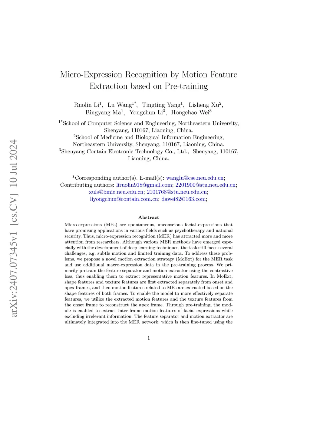 Micro-expressions (MEs) are spontaneous, unconscious facial expressions that have promising applications in various fields such as psychotherapy and national security. Thus, micro-expression recognition (MER) has attracted more and more attention from researchers. Although various MER methods have emerged especially with the development of deep learning techniques, the task still faces several challenges, e.g. subtle motion and limited training data. To address these problems, we propose a novel motion extraction strategy (MoExt) for the MER task and use additional macro-expression data in the pre-training process. We primarily pretrain the feature separator and motion extractor using the contrastive loss, thus enabling them to extract representative motion features. In MoExt, shape features and texture features are first extracted separately from onset and apex frames, and then motion features related to MEs are extracted based on the shape features of both frames. To enable the model to more effectively separate features, we utilize the extracted motion features and the texture features from the onset frame to reconstruct the apex frame. Through pre-training, the module is enabled to extract inter-frame motion features of facial expressions while excluding irrelevant information. The feature separator and motion extractor are ultimately integrated into the MER network, which is then fine-tuned using the target ME data. The effectiveness of proposed method is validated on three commonly used datasets, i.e., CASME II, SMIC, SAMM, and CAS(ME)3 dataset. The results show that our method performs favorably against state-of-the-art methods.