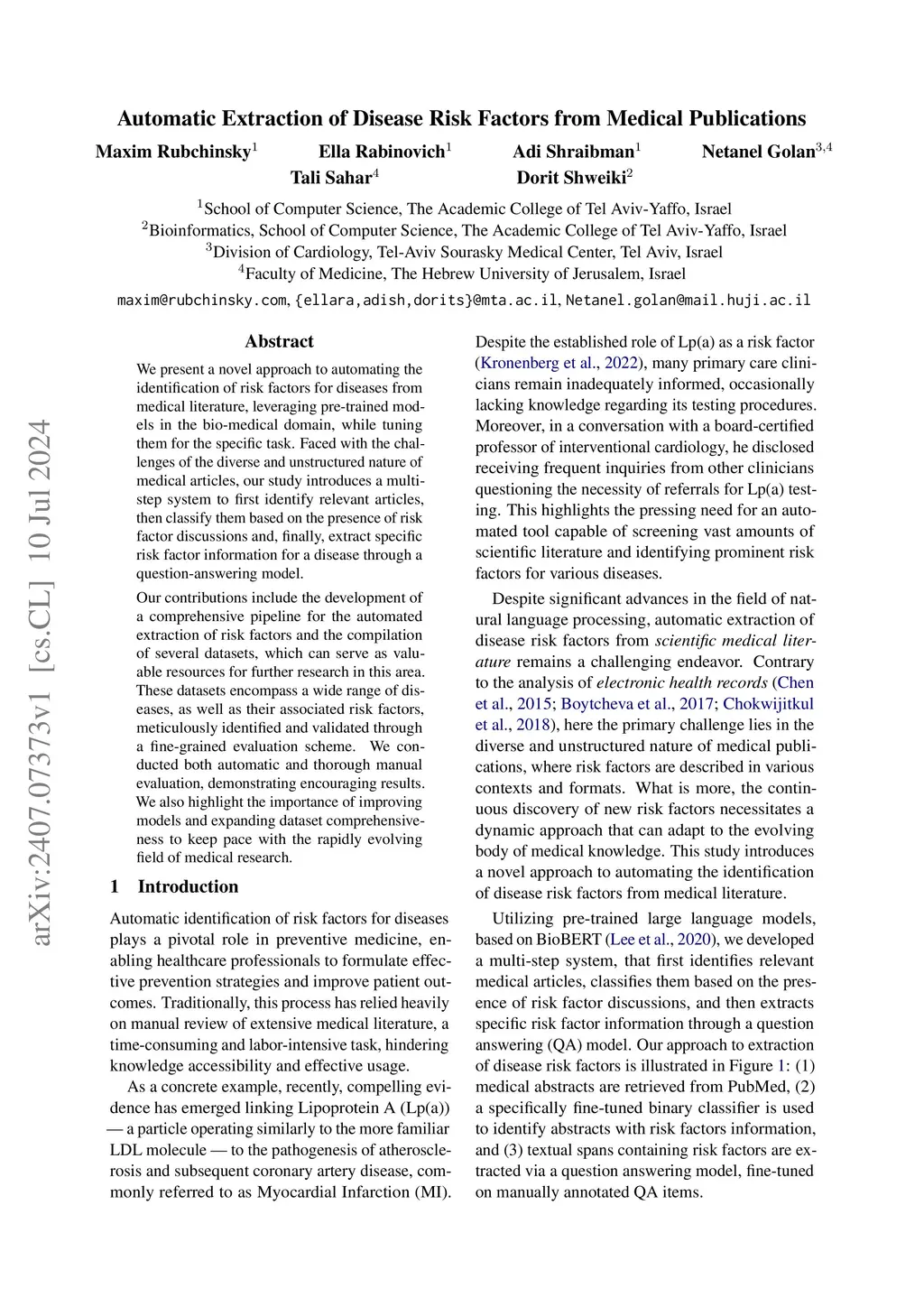 We present a novel approach to automating the identification of risk factors for diseases from medical literature, leveraging pre-trained models in the bio-medical domain, while tuning them for the specific task. Faced with the challenges of the diverse and unstructured nature of medical articles, our study introduces a multi-step system to first identify relevant articles, then classify them based on the presence of risk factor discussions and, finally, extract specific risk factor information for a disease through a question-answering model. Our contributions include the development of a comprehensive pipeline for the automated extraction of risk factors and the compilation of several datasets, which can serve as valuable resources for further research in this area. These datasets encompass a wide range of diseases, as well as their associated risk factors, meticulously identified and validated through a fine-grained evaluation scheme. We conducted both automatic and thorough manual evaluation, demonstrating encouraging results. We also highlight the importance of improving models and expanding dataset comprehensiveness to keep pace with the rapidly evolving field of medical research.
