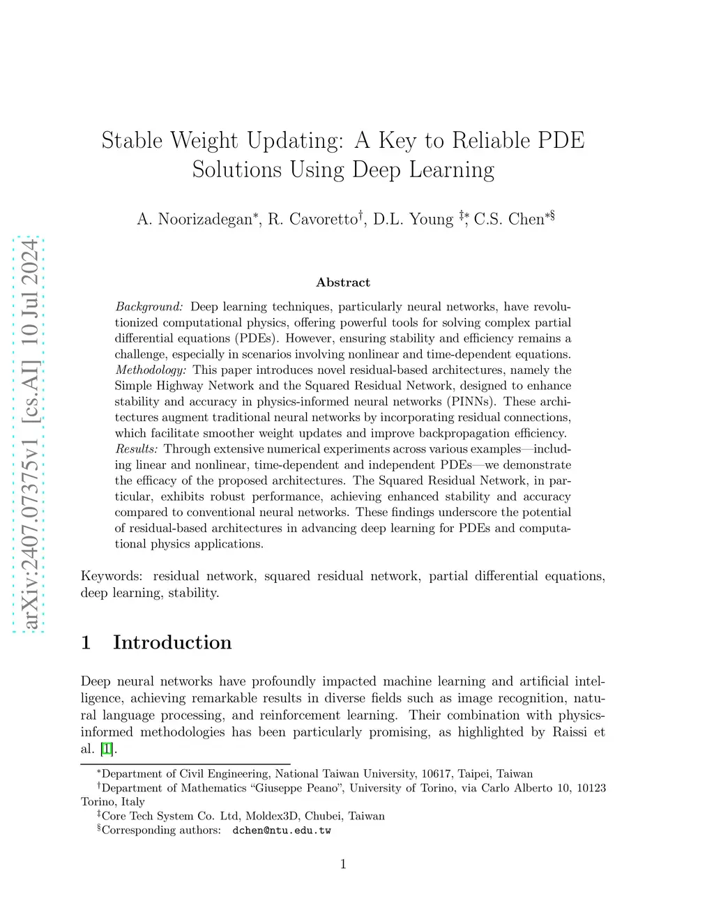 Background: Deep learning techniques, particularly neural networks, have revolutionized computational physics, offering powerful tools for solving complex partial differential equations (PDEs). However, ensuring stability and efficiency remains a challenge, especially in scenarios involving nonlinear and time-dependent equations. Methodology: This paper introduces novel residual-based architectures, namely the Simple Highway Network and the Squared Residual Network, designed to enhance stability and accuracy in physics-informed neural networks (PINNs). These architectures augment traditional neural networks by incorporating residual connections, which facilitate smoother weight updates and improve backpropagation efficiency. Results: Through extensive numerical experiments across various examples including linear and nonlinear, time-dependent and independent PDEs we demonstrate the efficacy of the proposed architectures. The Squared Residual Network, in particular, exhibits robust performance, achieving enhanced stability and accuracy compared to conventional neural networks. These findings underscore the potential of residual-based architectures in advancing deep learning for PDEs and computational physics applications.