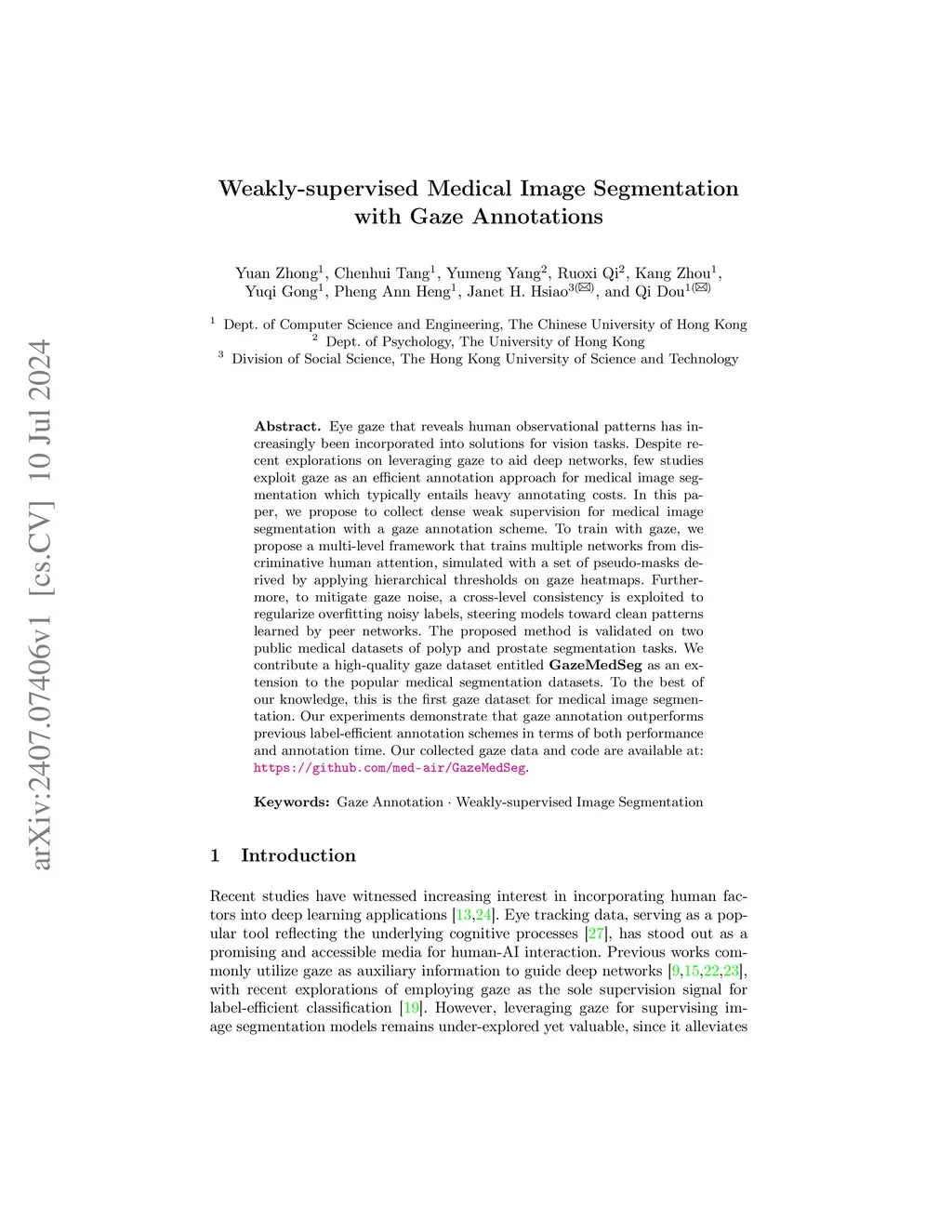 Eye gaze that reveals human observational patterns has increasingly been incorporated into solutions for vision tasks. Despite recent explorations on leveraging gaze to aid deep networks, few studies exploit gaze as an efficient annotation approach for medical image segmentation which typically entails heavy annotating costs. In this paper, we propose to collect dense weak supervision for medical image segmentation with a gaze annotation scheme. To train with gaze, we propose a multi-level framework that trains multiple networks from discriminative human attention, simulated with a set of pseudo-masks derived by applying hierarchical thresholds on gaze heatmaps. Furthermore, to mitigate gaze noise, a cross-level consistency is exploited to regularize overfitting noisy labels, steering models toward clean patterns learned by peer networks. The proposed method is validated on two public medical datasets of polyp and prostate segmentation tasks. We contribute a high-quality gaze dataset entitled GazeMedSeg as an extension to the popular medical segmentation datasets. To the best of our knowledge, this is the first gaze dataset for medical image segmentation. Our experiments demonstrate that gaze annotation outperforms previous label-efficient annotation schemes in terms of both performance and annotation time. Our collected gaze data and code are available at: https://github.com/med-air/GazeMedSeg.