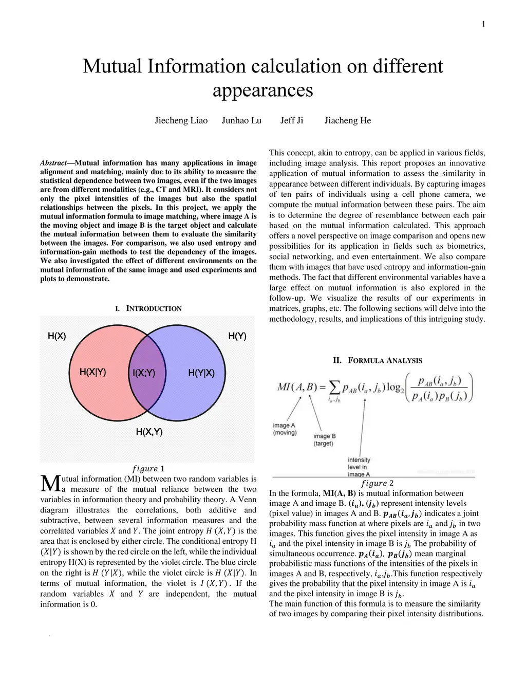 Mutual information has many applications in image alignment and matching, mainly due to its ability to measure the statistical dependence between two images, even if the two images are from different modalities (e.g., CT and MRI). It considers not only the pixel intensities of the images but also the spatial relationships between the pixels. In this project, we apply the mutual information formula to image matching, where image A is the moving object and image B is the target object and calculate the mutual information between them to evaluate the similarity between the images. For comparison, we also used entropy and information-gain methods to test the dependency of the images. We also investigated the effect of different environments on the mutual information of the same image and used experiments and plots to demonstrate.