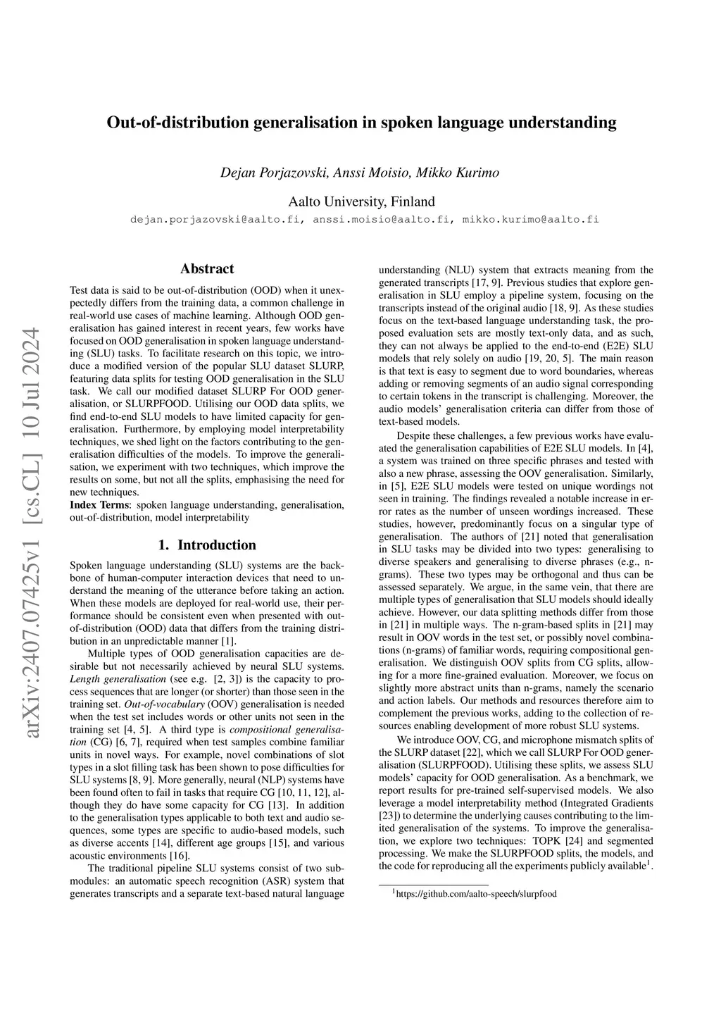 Test data is said to be out-of-distribution (OOD) when it unexpectedly differs from the training data, a common challenge in real-world use cases of machine learning. Although OOD generalisation has gained interest in recent years, few works have focused on OOD generalisation in spoken language understanding (SLU) tasks. To facilitate research on this topic, we introduce a modified version of the popular SLU dataset SLURP, featuring data splits for testing OOD generalisation in the SLU task. We call our modified dataset SLURP For OOD generalisation, or SLURPFOOD. Utilising our OOD data splits, we find end-to-end SLU models to have limited capacity for generalisation. Furthermore, by employing model interpretability techniques, we shed light on the factors contributing to the generalisation difficulties of the models. To improve the generalisation, we experiment with two techniques, which improve the results on some, but not all the splits, emphasising the need for new techniques.