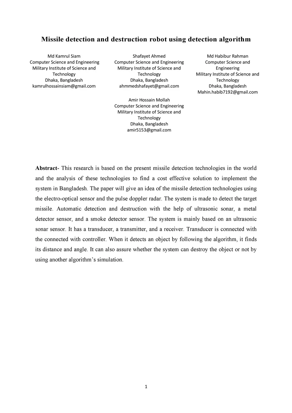 This research is based on the present missile detection technologies in the world and the analysis of these technologies to find a cost effective solution to implement the system in Bangladesh. The paper will give an idea of the missile detection technologies using the electro-optical sensor and the pulse doppler radar. The system is made to detect the target missile. Automatic detection and destruction with the help of ultrasonic sonar, a metal detector sensor, and a smoke detector sensor. The system is mainly based on an ultrasonic sonar sensor. It has a transducer, a transmitter, and a receiver. Transducer is connected with the connected with controller. When it detects an object by following the algorithm, it finds its distance and angle. It can also assure whether the system can destroy the object or not by using another algorithm's simulation.