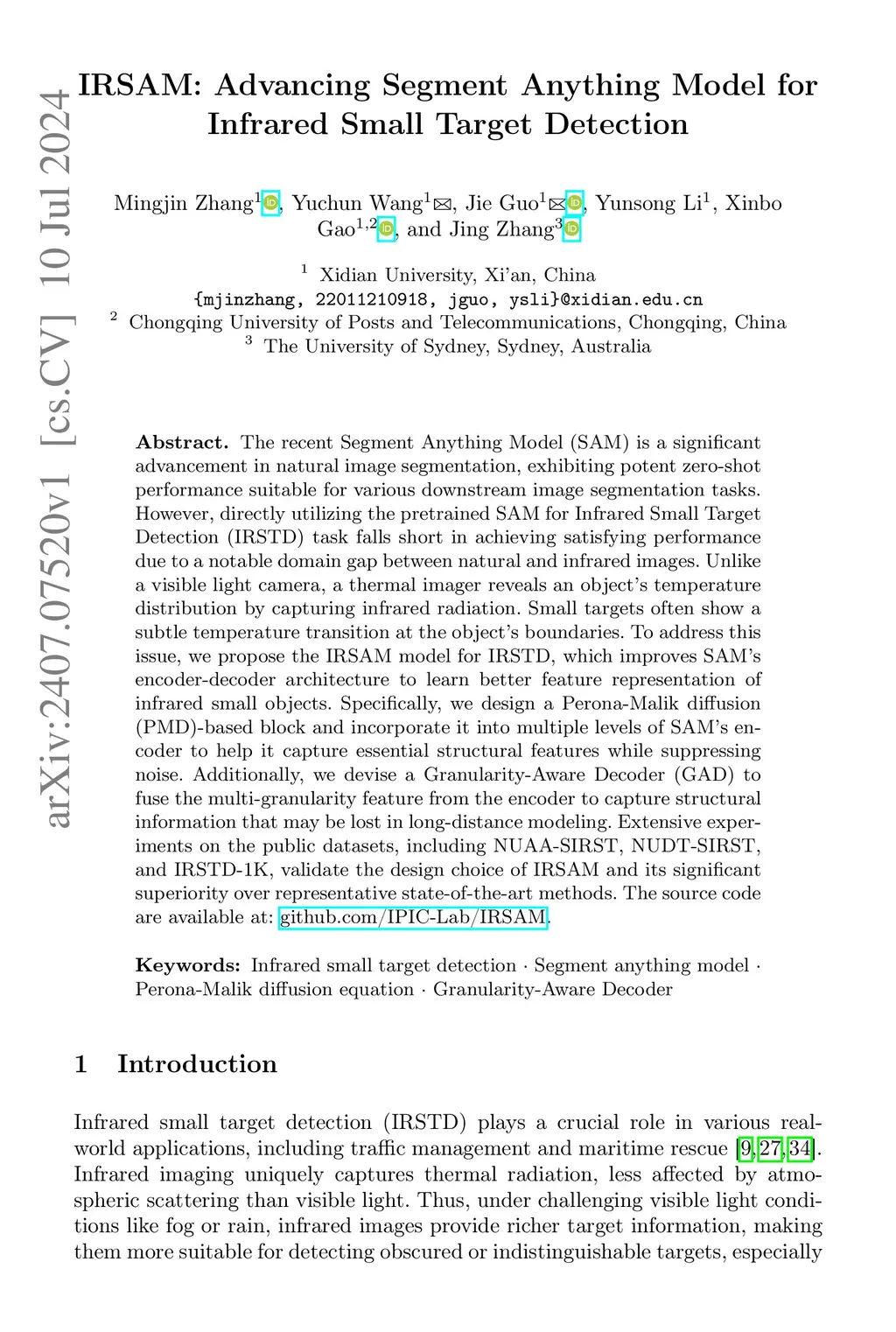 The recent Segment Anything Model (SAM) is a significant advancement in natural image segmentation, exhibiting potent zero-shot performance suitable for various downstream image segmentation tasks. However, directly utilizing the pretrained SAM for Infrared Small Target Detection (IRSTD) task falls short in achieving satisfying performance due to a notable domain gap between natural and infrared images. Unlike a visible light camera, a thermal imager reveals an object's temperature distribution by capturing infrared radiation. Small targets often show a subtle temperature transition at the object's boundaries. To address this issue, we propose the IRSAM model for IRSTD, which improves SAM's encoder-decoder architecture to learn better feature representation of infrared small objects. Specifically, we design a Perona-Malik diffusion (PMD)-based block and incorporate it into multiple levels of SAM's encoder to help it capture essential structural features while suppressing noise. Additionally, we devise a Granularity-Aware Decoder (GAD) to fuse the multi-granularity feature from the encoder to capture structural information that may be lost in long-distance modeling. Extensive experiments on the public datasets, including NUAA-SIRST, NUDT-SIRST, and IRSTD-1K, validate the design choice of IRSAM and its significant superiority over representative state-of-the-art methods. The source code are available at: github.com/IPIC-Lab/IRSAM.