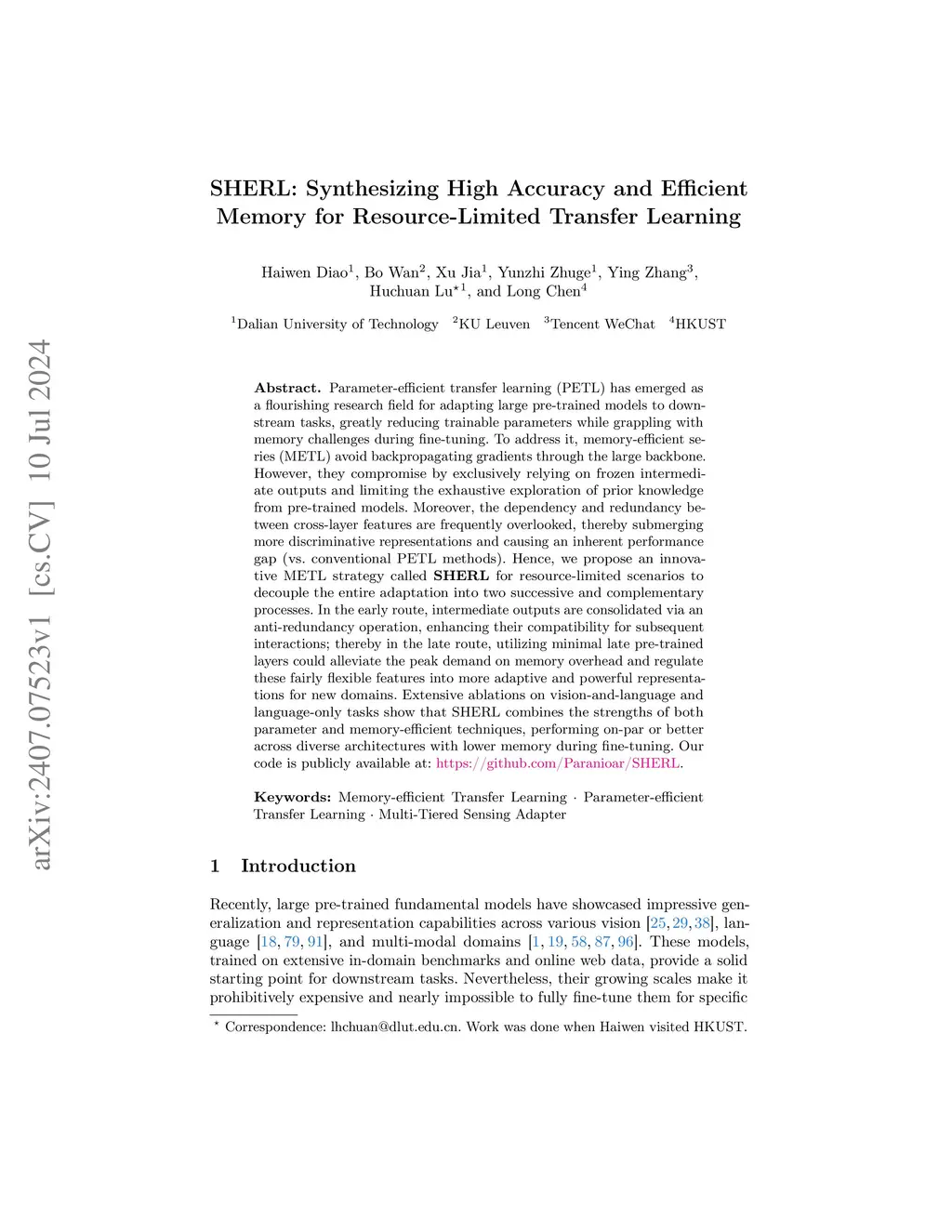 Parameter-efficient transfer learning (PETL) has emerged as a flourishing research field for adapting large pre-trained models to downstream tasks, greatly reducing trainable parameters while grappling with memory challenges during fine-tuning. To address it, memory-efficient series (METL) avoid backpropagating gradients through the large backbone. However, they compromise by exclusively relying on frozen intermediate outputs and limiting the exhaustive exploration of prior knowledge from pre-trained models. Moreover, the dependency and redundancy between cross-layer features are frequently overlooked, thereby submerging more discriminative representations and causing an inherent performance gap (vs. conventional PETL methods). Hence, we propose an innovative METL strategy called SHERL for resource-limited scenarios to decouple the entire adaptation into two successive and complementary processes. In the early route, intermediate outputs are consolidated via an anti-redundancy operation, enhancing their compatibility for subsequent interactions; thereby in the late route, utilizing minimal late pre-trained layers could alleviate the peak demand on memory overhead and regulate these fairly flexible features into more adaptive and powerful representations for new domains. Extensive ablations on vision-and-language and language-only tasks show that SHERL combines the strengths of both parameter and memory-efficient techniques, performing on-par or better across diverse architectures with lower memory during fine-tuning. Our code is publicly available at: https://github.com/Paranioar/SHERL.