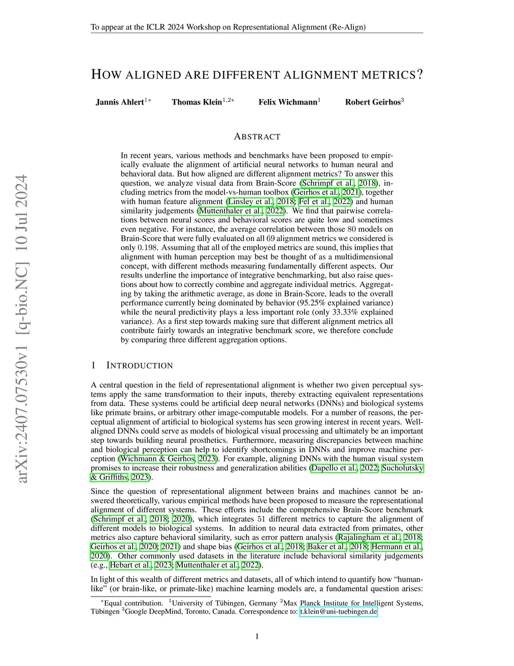 In recent years, various methods and benchmarks have been proposed to empirically evaluate the alignment of artificial neural networks to human neural and behavioral data. But how aligned are different alignment metrics? To answer this question, we analyze visual data from Brain-Score (Schrimpf et al., 2018), including metrics from the model-vs-human toolbox (Geirhos et al., 2021), together with human feature alignment (Linsley et al., 2018; Fel et al., 2022) and human similarity judgements (Muttenthaler et al., 2022). We find that pairwise correlations between neural scores and behavioral scores are quite low and sometimes even negative. For instance, the average correlation between those 80 models on Brain-Score that were fully evaluated on all 69 alignment metrics we considered is only 0.198. Assuming that all of the employed metrics are sound, this implies that alignment with human perception may best be thought of as a multidimensional concept, with different methods measuring fundamentally different aspects. Our results underline the importance of integrative benchmarking, but also raise questions about how to correctly combine and aggregate individual metrics. Aggregating by taking the arithmetic average, as done in Brain-Score, leads to the overall performance currently being dominated by behavior (95.25% explained variance) while the neural predictivity plays a less important role (only 33.33% explained variance). As a first step towards making sure that different alignment metrics all contribute fairly towards an integrative benchmark score, we therefore conclude by comparing three different aggregation options.