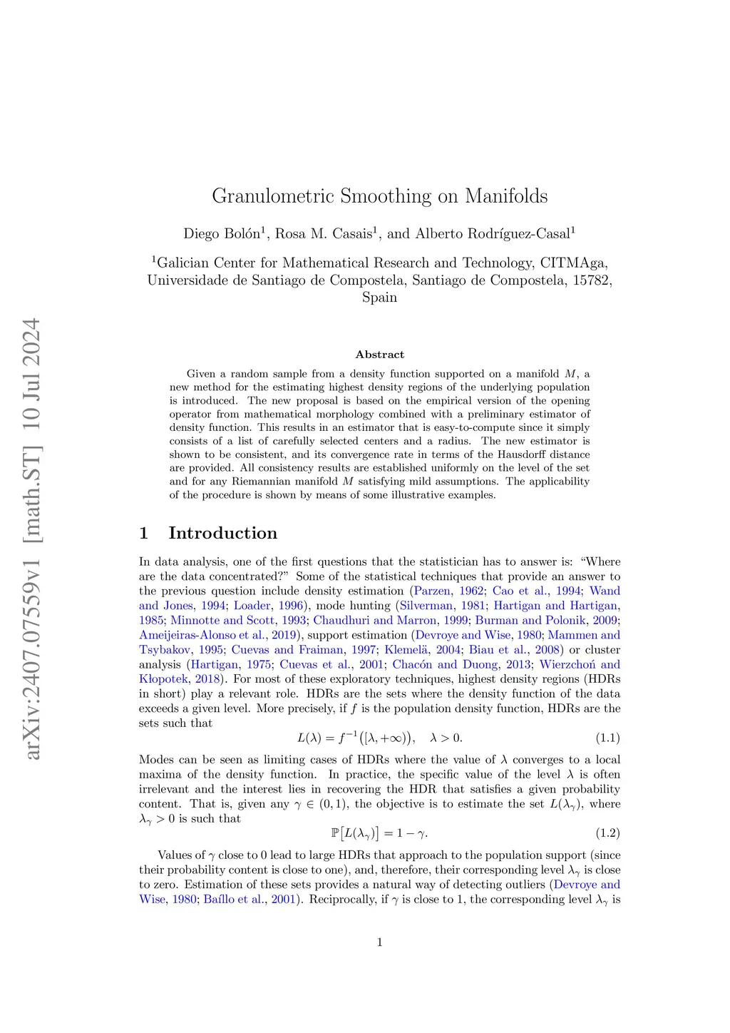 Given a random sample from a density function supported on a manifold M, a new method for the estimating highest density regions of the underlying population is introduced. The new proposal is based on the empirical version of the opening operator from mathematical morphology combined with a preliminary estimator of density function. This results in an estimator that is easy-to-compute since it simply consists of a list of carefully selected centers and a radius. The new estimator is shown to be consistent, and its convergence rate in terms of the Hausdorff distance are provided. All consistency results are established uniformly on the level of the set and for any Riemannian manifold M satisfying mild assumptions. The applicability of the procedure is shown by means of some illustrative examples.