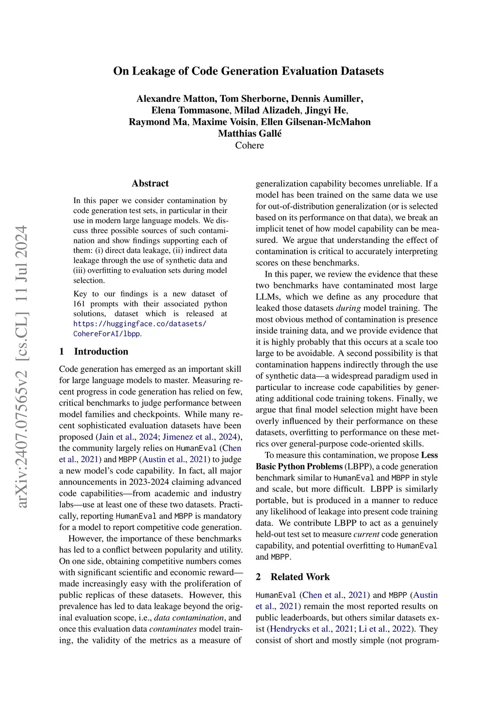 In this paper we consider contamination by code generation test sets, in particular in their use in modern large language models. We discuss three possible sources of such contamination and show findings supporting each of them: (i) direct data leakage, (ii) indirect data leakage through the use of synthetic data and (iii) overfitting to evaluation sets during model selection. Key to our findings is a new dataset of 161 prompts with their associated python solutions, dataset which is released at https://huggingface.co/datasets/CohereForAI/lbpp .