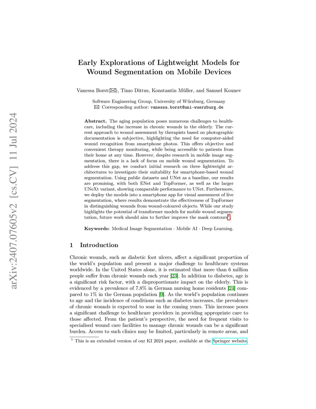 The aging population poses numerous challenges to healthcare, including the increase in chronic wounds in the elderly. The current approach to wound assessment by therapists based on photographic documentation is subjective, highlighting the need for computer-aided wound recognition from smartphone photos. This offers objective and convenient therapy monitoring, while being accessible to patients from their home at any time. However, despite research in mobile image segmentation, there is a lack of focus on mobile wound segmentation. To address this gap, we conduct initial research on three lightweight architectures to investigate their suitability for smartphone-based wound segmentation. Using public datasets and UNet as a baseline, our results are promising, with both ENet and TopFormer, as well as the larger UNeXt variant, showing comparable performance to UNet. Furthermore, we deploy the models into a smartphone app for visual assessment of live segmentation, where results demonstrate the effectiveness of TopFormer in distinguishing wounds from wound-coloured objects. While our study highlights the potential of transformer models for mobile wound segmentation, future work should aim to further improve the mask contours.