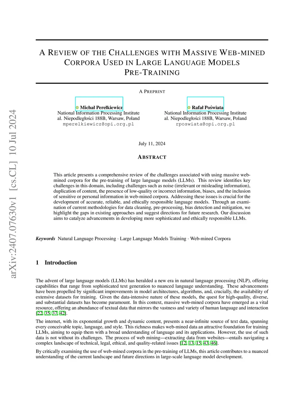 This article presents a comprehensive review of the challenges associated with using massive web-mined corpora for the pre-training of large language models (LLMs). This review identifies key challenges in this domain, including challenges such as noise (irrelevant or misleading information), duplication of content, the presence of low-quality or incorrect information, biases, and the inclusion of sensitive or personal information in web-mined corpora. Addressing these issues is crucial for the development of accurate, reliable, and ethically responsible language models. Through an examination of current methodologies for data cleaning, pre-processing, bias detection and mitigation, we highlight the gaps in existing approaches and suggest directions for future research. Our discussion aims to catalyze advancements in developing more sophisticated and ethically responsible LLMs.