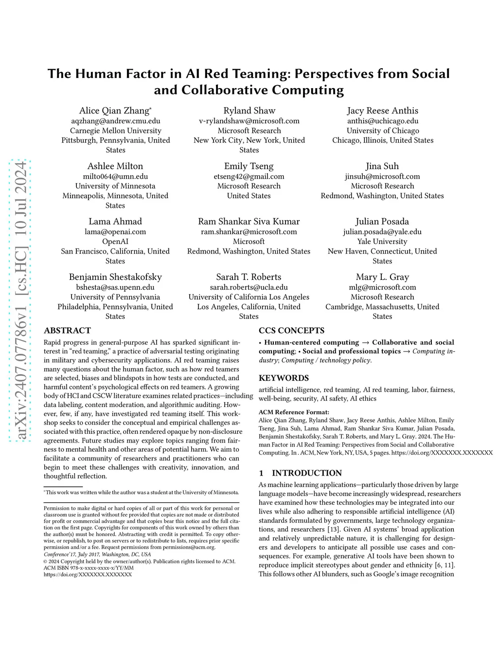 Rapid progress in general-purpose AI has sparked significant interest in "red teaming," a practice of adversarial testing originating in military and cybersecurity applications. AI red teaming raises many questions about the human factor, such as how red teamers are selected, biases and blindspots in how tests are conducted, and harmful content's psychological effects on red teamers. A growing body of HCI and CSCW literature examines related practices-including data labeling, content moderation, and algorithmic auditing. However, few, if any, have investigated red teaming itself. This workshop seeks to consider the conceptual and empirical challenges associated with this practice, often rendered opaque by non-disclosure agreements. Future studies may explore topics ranging from fairness to mental health and other areas of potential harm. We aim to facilitate a community of researchers and practitioners who can begin to meet these challenges with creativity, innovation, and thoughtful reflection.