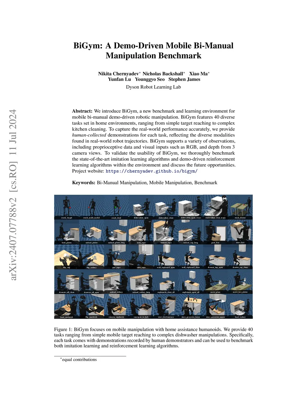 We introduce BiGym, a new benchmark and learning environment for mobile bi-manual demo-driven robotic manipulation. BiGym features 40 diverse tasks set in home environments, ranging from simple target reaching to complex kitchen cleaning. To capture the real-world performance accurately, we provide human-collected demonstrations for each task, reflecting the diverse modalities found in real-world robot trajectories. BiGym supports a variety of observations, including proprioceptive data and visual inputs such as RGB, and depth from 3 camera views. To validate the usability of BiGym, we thoroughly benchmark the state-of-the-art imitation learning algorithms and demo-driven reinforcement learning algorithms within the environment and discuss the future opportunities.