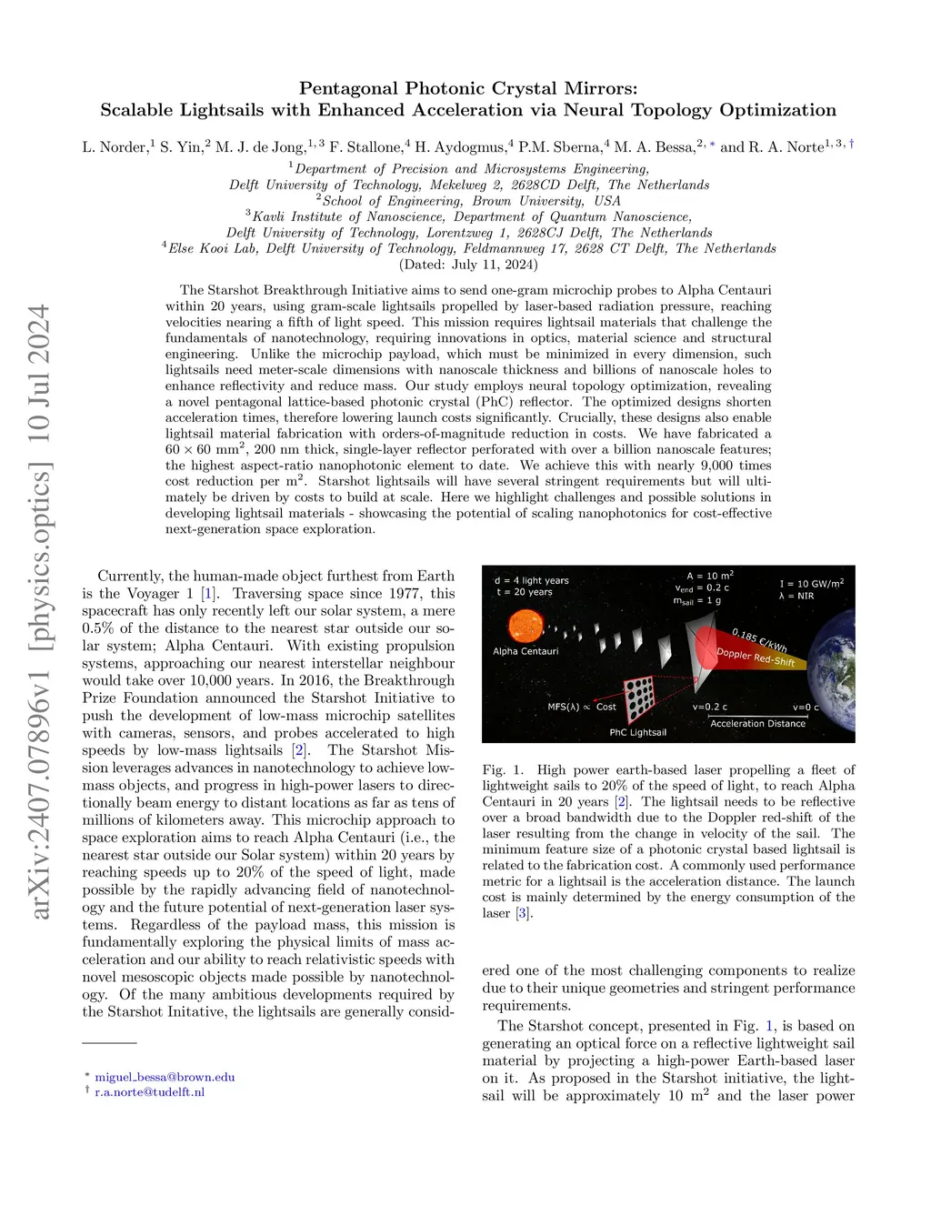 The Starshot Breakthrough Initiative aims to send one-gram microchip probes to Alpha Centauri within 20 years, using gram-scale lightsails propelled by laser-based radiation pressure, reaching velocities nearing a fifth of light speed. This mission requires lightsail materials that challenge the fundamentals of nanotechnology, requiring innovations in optics, material science and structural engineering. Unlike the microchip payload, which must be minimized in every dimension, such lightsails need meter-scale dimensions with nanoscale thickness and billions of nanoscale holes to enhance reflectivity and reduce mass. Our study employs neural topology optimization, revealing a novel pentagonal lattice-based photonic crystal (PhC) reflector. The optimized designs shorten acceleration times, therefore lowering launch costs significantly. Crucially, these designs also enable lightsail material fabrication with orders-of-magnitude reduction in costs. We have fabricated a 60 x 60 mm, 200nm thick, single-layer reflector perforated with over a billion nanoscale features; the highest aspect-ratio nanophotonic element to date. We achieve this with nearly 9,000 times cost reduction per m. Starshot lightsails will have several stringent requirements but will ultimately be driven by costs to build at scale. Here we highlight challenges and possible solutions in developing lightsail materials - showcasing the potential of scaling nanophotonics for cost-effective next-generation space exploration.