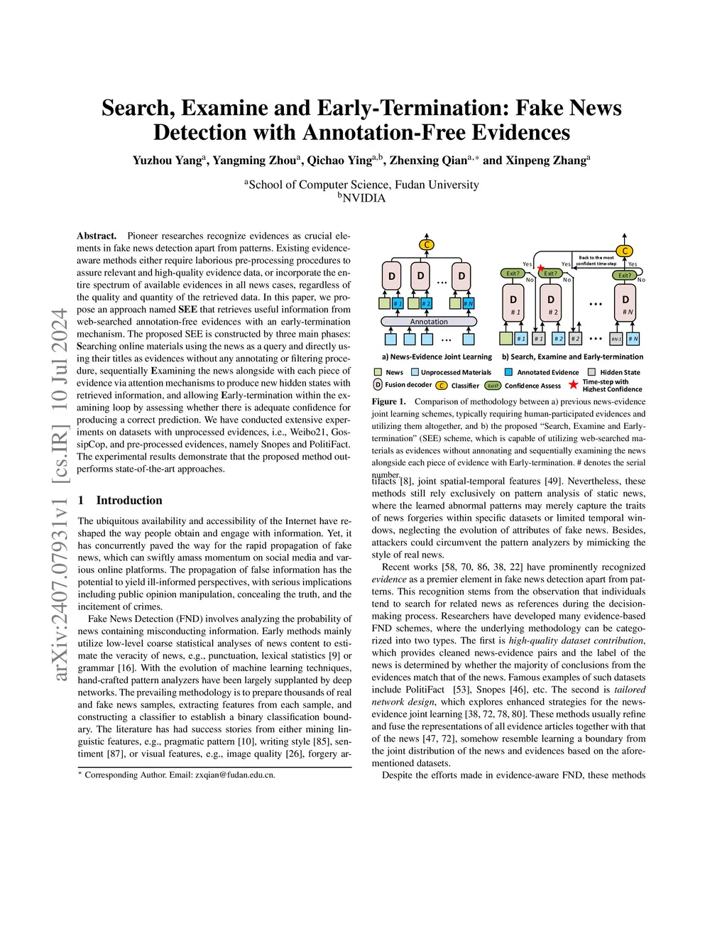 Pioneer researches recognize evidences as crucial elements in fake news detection apart from patterns. Existing evidence-aware methods either require laborious pre-processing procedures to assure relevant and high-quality evidence data, or incorporate the entire spectrum of available evidences in all news cases, regardless of the quality and quantity of the retrieved data. In this paper, we propose an approach named \textbf{SEE} that retrieves useful information from web-searched annotation-free evidences with an early-termination mechanism. The proposed SEE is constructed by three main phases: \textbf{S}earching online materials using the news as a query and directly using their titles as evidences without any annotating or filtering procedure, sequentially \textbf{E}xamining the news alongside with each piece of evidence via attention mechanisms to produce new hidden states with retrieved information, and allowing \textbf{E}arly-termination within the examining loop by assessing whether there is adequate confidence for producing a correct prediction. We have conducted extensive experiments on datasets with unprocessed evidences, i.e., Weibo21, GossipCop, and pre-processed evidences, namely Snopes and PolitiFact. The experimental results demonstrate that the proposed method outperforms state-of-the-art approaches.
