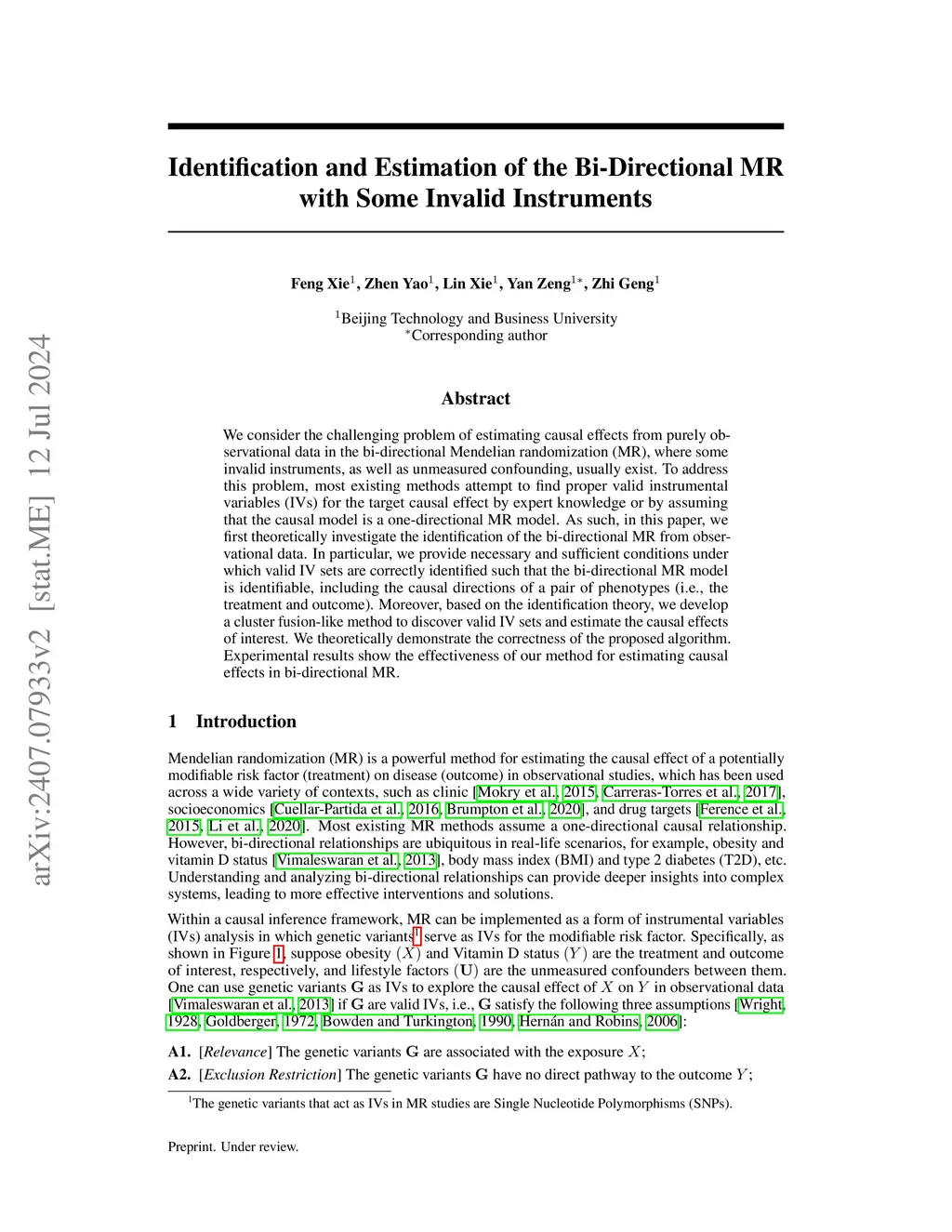 We consider the challenging problem of estimating causal effects from purely observational data in the bi-directional Mendelian randomization (MR), where some invalid instruments, as well as unmeasured confounding, usually exist. To address this problem, most existing methods attempt to find proper valid instrumental variables (IVs) for the target causal effect by expert knowledge or by assuming that the causal model is a one-directional MR model. As such, in this paper, we first theoretically investigate the identification of the bi-directional MR from observational data. In particular, we provide necessary and sufficient conditions under which valid IV sets are correctly identified such that the bi-directional MR model is identifiable, including the causal directions of a pair of phenotypes (i.e., the treatment and outcome). Moreover, based on the identification theory, we develop a cluster fusion-like method to discover valid IV sets and estimate the causal effects of interest. We theoretically demonstrate the correctness of the proposed algorithm. Experimental results show the effectiveness of our method for estimating causal effects in bi-directional MR.