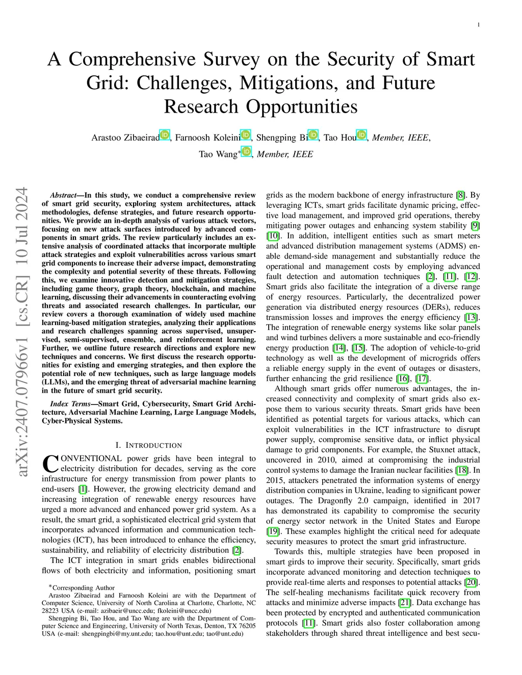 In this study, we conduct a comprehensive review of smart grid security, exploring system architectures, attack methodologies, defense strategies, and future research opportunities. We provide an in-depth analysis of various attack vectors, focusing on new attack surfaces introduced by advanced components in smart grids. The review particularly includes an extensive analysis of coordinated attacks that incorporate multiple attack strategies and exploit vulnerabilities across various smart grid components to increase their adverse impact, demonstrating the complexity and potential severity of these threats. Following this, we examine innovative detection and mitigation strategies, including game theory, graph theory, blockchain, and machine learning, discussing their advancements in counteracting evolving threats and associated research challenges. In particular, our review covers a thorough examination of widely used machine learning-based mitigation strategies, analyzing their applications and research challenges spanning across supervised, unsupervised, semi-supervised, ensemble, and reinforcement learning. Further, we outline future research directions and explore new techniques and concerns. We first discuss the research opportunities for existing and emerging strategies, and then explore the potential role of new techniques, such as large language models (LLMs), and the emerging threat of adversarial machine learning in the future of smart grid security.