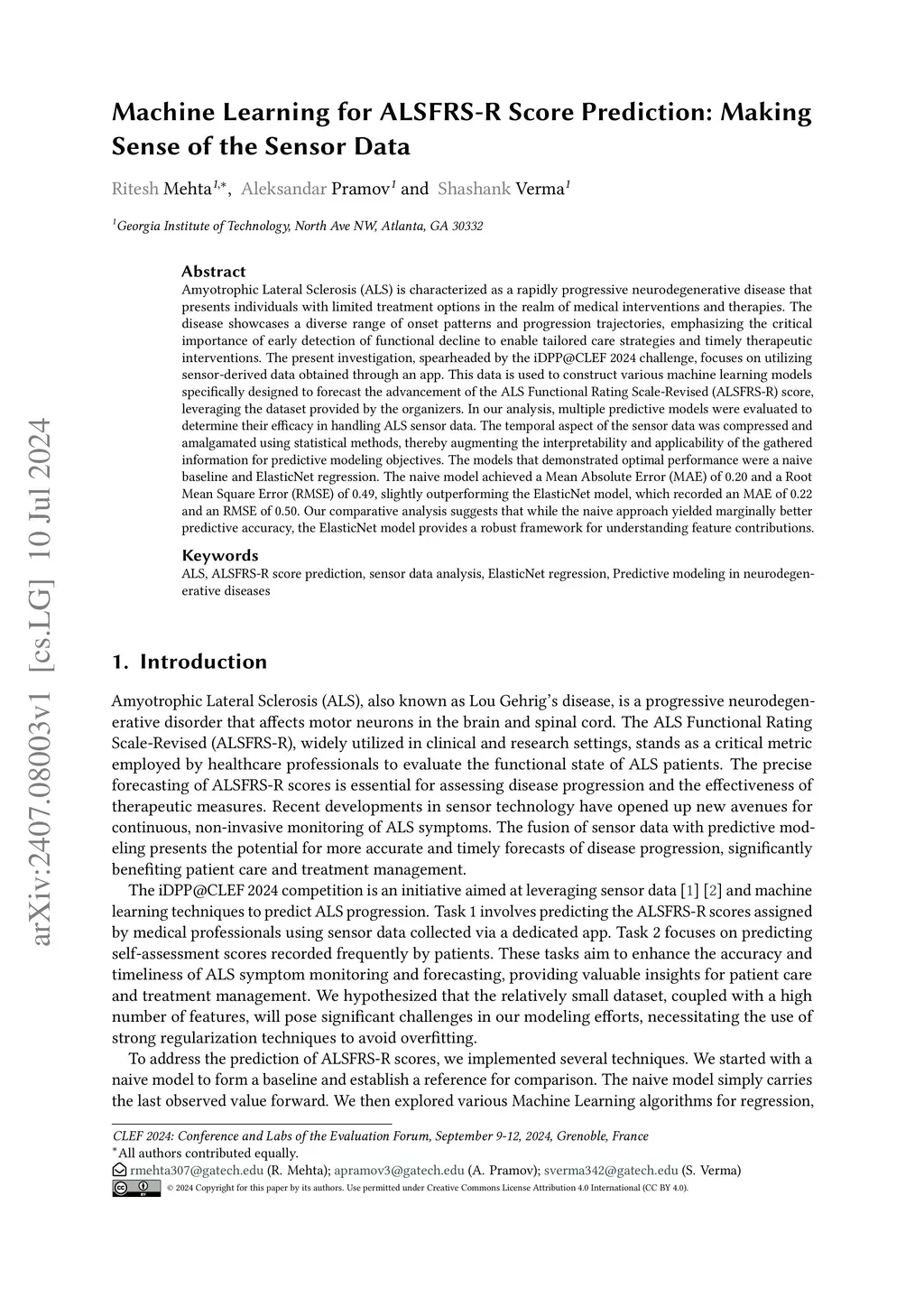 Amyotrophic Lateral Sclerosis (ALS) is characterized as a rapidly progressive neurodegenerative disease that presents individuals with limited treatment options in the realm of medical interventions and therapies. The disease showcases a diverse range of onset patterns and progression trajectories, emphasizing the critical importance of early detection of functional decline to enable tailored care strategies and timely therapeutic interventions. The present investigation, spearheaded by the iDPP@CLEF 2024 challenge, focuses on utilizing sensor-derived data obtained through an app. This data is used to construct various machine learning models specifically designed to forecast the advancement of the ALS Functional Rating Scale-Revised (ALSFRS-R) score, leveraging the dataset provided by the organizers. In our analysis, multiple predictive models were evaluated to determine their efficacy in handling ALS sensor data. The temporal aspect of the sensor data was compressed and amalgamated using statistical methods, thereby augmenting the interpretability and applicability of the gathered information for predictive modeling objectives. The models that demonstrated optimal performance were a naive baseline and ElasticNet regression. The naive model achieved a Mean Absolute Error (MAE) of 0.20 and a Root Mean Square Error (RMSE) of 0.49, slightly outperforming the ElasticNet model, which recorded an MAE of 0.22 and an RMSE of 0.50. Our comparative analysis suggests that while the naive approach yielded marginally better predictive accuracy, the ElasticNet model provides a robust framework for understanding feature contributions.