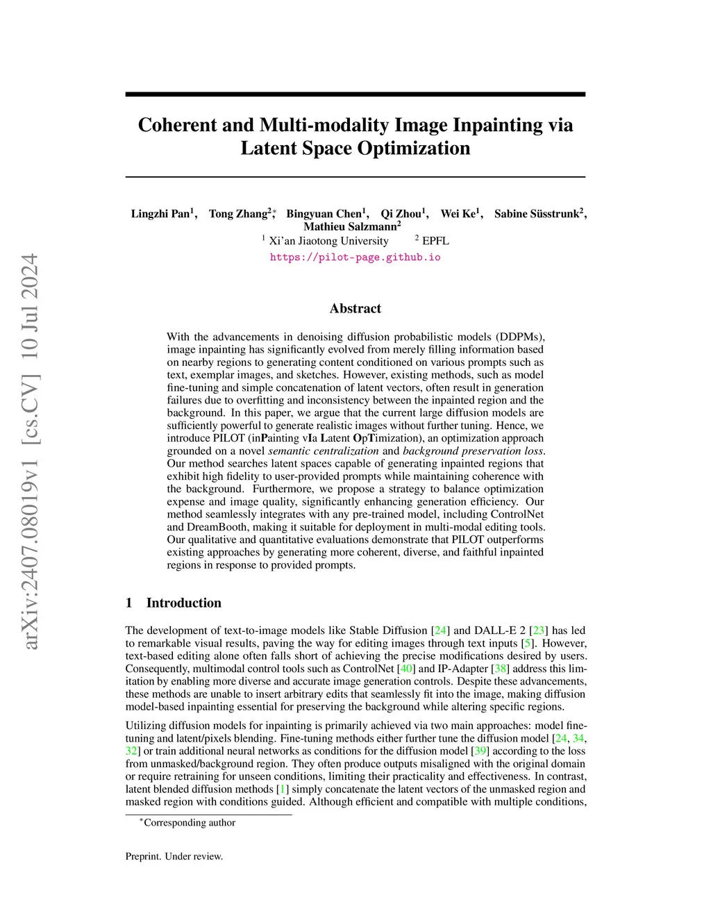 With the advancements in denoising diffusion probabilistic models (DDPMs), image inpainting has significantly evolved from merely filling information based on nearby regions to generating content conditioned on various prompts such as text, exemplar images, and sketches. However, existing methods, such as model fine-tuning and simple concatenation of latent vectors, often result in generation failures due to overfitting and inconsistency between the inpainted region and the background. In this paper, we argue that the current large diffusion models are sufficiently powerful to generate realistic images without further tuning. Hence, we introduce PILOT (in\textbf{P}ainting v\textbf{I}a \textbf{L}atent \textbf{O}p\textbf{T}imization), an optimization approach grounded on a novel \textit{semantic centralization} and \textit{background preservation loss}. Our method searches latent spaces capable of generating inpainted regions that exhibit high fidelity to user-provided prompts while maintaining coherence with the background. Furthermore, we propose a strategy to balance optimization expense and image quality, significantly enhancing generation efficiency. Our method seamlessly integrates with any pre-trained model, including ControlNet and DreamBooth, making it suitable for deployment in multi-modal editing tools. Our qualitative and quantitative evaluations demonstrate that PILOT outperforms existing approaches by generating more coherent, diverse, and faithful inpainted regions in response to provided prompts.