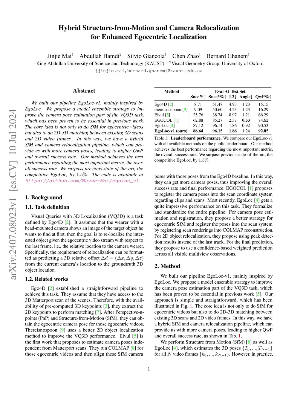 We built our pipeline EgoLoc-v1, mainly inspired by EgoLoc. We propose a model ensemble strategy to improve the camera pose estimation part of the VQ3D task, which has been proven to be essential in previous work. The core idea is not only to do SfM for egocentric videos but also to do 2D-3D matching between existing 3D scans and 2D video frames. In this way, we have a hybrid SfM and camera relocalization pipeline, which can provide us with more camera poses, leading to higher QwP and overall success rate. Our method achieves the best performance regarding the most important metric, the overall success rate. We surpass previous state-of-the-art, the competitive EgoLoc, by . The code is available at \url{https://github.com/Wayne-Mai/egoloc_v1}.