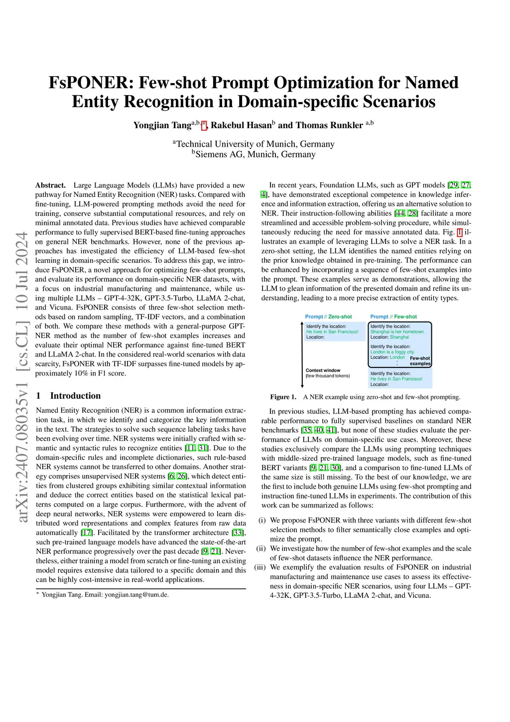 Large Language Models (LLMs) have provided a new pathway for Named Entity Recognition (NER) tasks. Compared with fine-tuning, LLM-powered prompting methods avoid the need for training, conserve substantial computational resources, and rely on minimal annotated data. Previous studies have achieved comparable performance to fully supervised BERT-based fine-tuning approaches on general NER benchmarks. However, none of the previous approaches has investigated the efficiency of LLM-based few-shot learning in domain-specific scenarios. To address this gap, we introduce FsPONER, a novel approach for optimizing few-shot prompts, and evaluate its performance on domain-specific NER datasets, with a focus on industrial manufacturing and maintenance, while using multiple LLMs -- GPT-4-32K, GPT-3.5-Turbo, LLaMA 2-chat, and Vicuna. FsPONER consists of three few-shot selection methods based on random sampling, TF-IDF vectors, and a combination of both. We compare these methods with a general-purpose GPT-NER method as the number of few-shot examples increases and evaluate their optimal NER performance against fine-tuned BERT and LLaMA 2-chat. In the considered real-world scenarios with data scarcity, FsPONER with TF-IDF surpasses fine-tuned models by approximately 10% in F1 score.