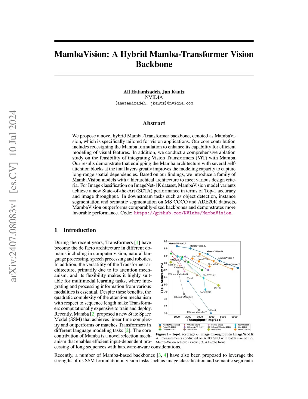 MambaVision: A Hybrid Mamba-Transformer Vision Backbone