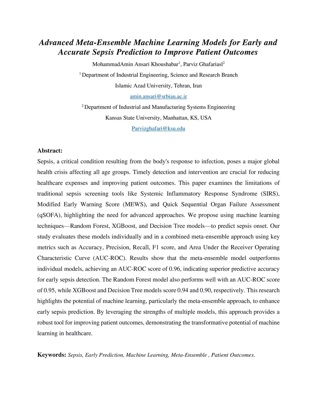 Sepsis, a critical condition from the body's response to infection, poses a major global health crisis affecting all age groups. Timely detection and intervention are crucial for reducing healthcare expenses and improving patient outcomes. This paper examines the limitations of traditional sepsis screening tools like Systemic Inflammatory Response Syndrome, Modified Early Warning Score, and Quick Sequential Organ Failure Assessment, highlighting the need for advanced approaches. We propose using machine learning techniques - Random Forest, Extreme Gradient Boosting, and Decision Tree models - to predict sepsis onset. Our study evaluates these models individually and in a combined meta-ensemble approach using key metrics such as Accuracy, Precision, Recall, F1 score, and Area Under the Receiver Operating Characteristic Curve. Results show that the meta-ensemble model outperforms individual models, achieving an AUC-ROC score of 0.96, indicating superior predictive accuracy for early sepsis detection. The Random Forest model also performs well with an AUC-ROC score of 0.95, while Extreme Gradient Boosting and Decision Tree models score 0.94 and 0.90, respectively.