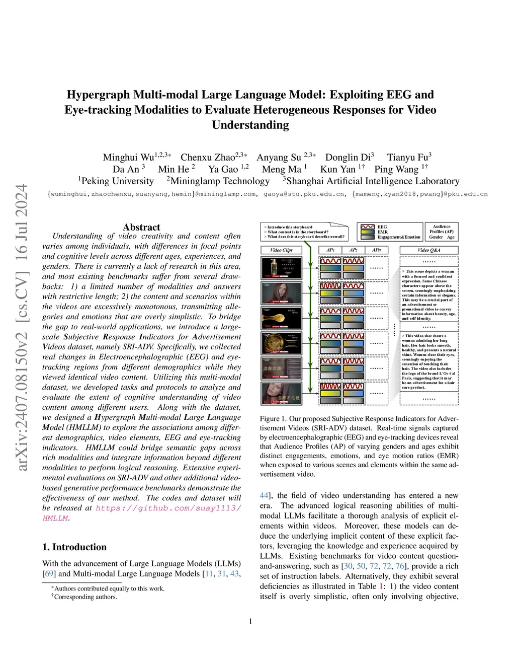 Understanding of video creativity and content often varies among individuals, with differences in focal points and cognitive levels across different ages, experiences, and genders. There is currently a lack of research in this area, and most existing benchmarks suffer from several drawbacks: 1) a limited number of modalities and answers with restrictive length; 2) the content and scenarios within the videos are excessively monotonous, transmitting allegories and emotions that are overly simplistic. To bridge the gap to real-world applications, we introduce a large-scale Subjective Response Indicators for Advertisement Videos dataset, namely SRI-ADV. Specifically, we collected real changes in Electroencephalographic (EEG) and eye-tracking regions from different demographics while they viewed identical video content. Utilizing this multi-modal dataset, we developed tasks and protocols to analyze and evaluate the extent of cognitive understanding of video content among different users. Along with the dataset, we designed a Hypergraph Multi-modal Large Language Model (HMLLM) to explore the associations among different demographics, video elements, EEG, and eye-tracking indicators. HMLLM could bridge semantic gaps across rich modalities and integrate information beyond different modalities to perform logical reasoning. Extensive experimental evaluations on SRI-ADV and other additional video-based generative performance benchmarks demonstrate the effectiveness of our method. The codes and dataset will be released at https://github.com/mininglamp-MLLM/HMLLM.