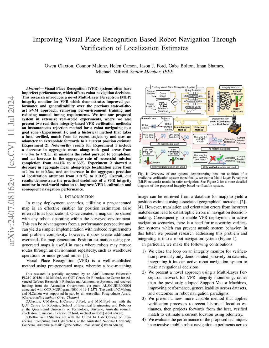 Visual Place Recognition (VPR) systems often have imperfect performance, which affects robot navigation decisions. This research introduces a novel Multi-Layer Perceptron (MLP) integrity monitor for VPR which demonstrates improved performance and generalizability over the previous state-of-the-art SVM approach, removing per-environment training and reducing manual tuning requirements. We test our proposed system in extensive real-world experiments, where we also present two real-time integrity-based VPR verification methods: an instantaneous rejection method for a robot navigating to a goal zone (Experiment 1); and a historical method that takes a best, verified, match from its recent trajectory and uses an odometer to extrapolate forwards to a current position estimate (Experiment 2). Noteworthy results for Experiment 1 include a decrease in aggregate mean along-track goal error from ~9.8m to ~3.1m in missions the robot pursued to completion, and an increase in the aggregate rate of successful mission completion from ~41% to ~55%. Experiment 2 showed a decrease in aggregate mean along-track localization error from ~2.0m to ~0.5m, and an increase in the aggregate precision of localization attempts from ~97% to ~99%. Overall, our results demonstrate the practical usefulness of a VPR integrity monitor in real-world robotics to improve VPR localization and consequent navigation performance.