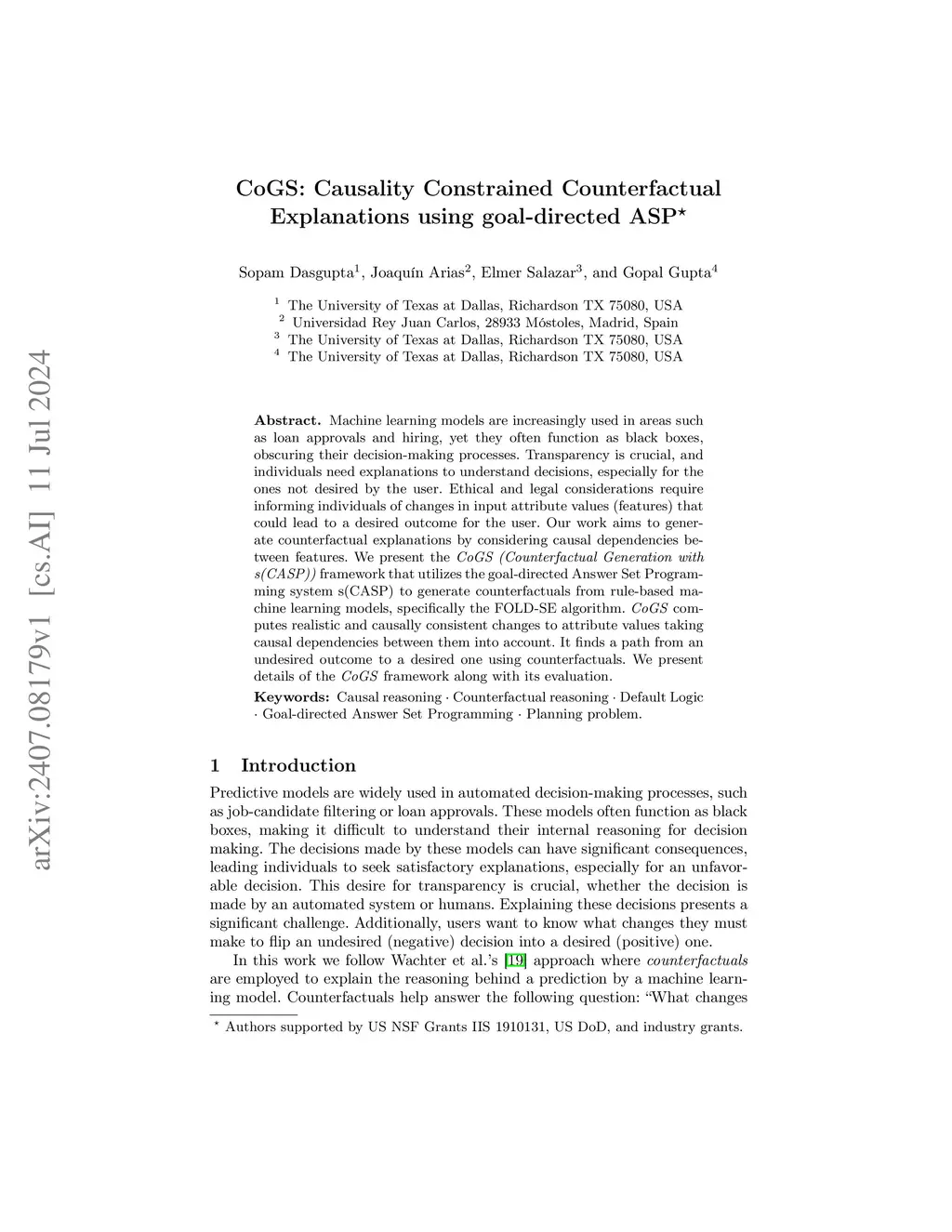 Machine learning models are increasingly used in areas such as loan approvals and hiring, yet they often function as black boxes, obscuring their decision-making processes. Transparency is crucial, and individuals need explanations to understand decisions, especially for the ones not desired by the user. Ethical and legal considerations require informing individuals of changes in input attribute values (features) that could lead to a desired outcome for the user. Our work aims to generate counterfactual explanations by considering causal dependencies between features. We present the CoGS (Counterfactual Generation with s(CASP)) framework that utilizes the goal-directed Answer Set Programming system s(CASP) to generate counterfactuals from rule-based machine learning models, specifically the FOLD-SE algorithm. CoGS computes realistic and causally consistent changes to attribute values taking causal dependencies between them into account. It finds a path from an undesired outcome to a desired one using counterfactuals. We present details of the CoGS framework along with its evaluation.