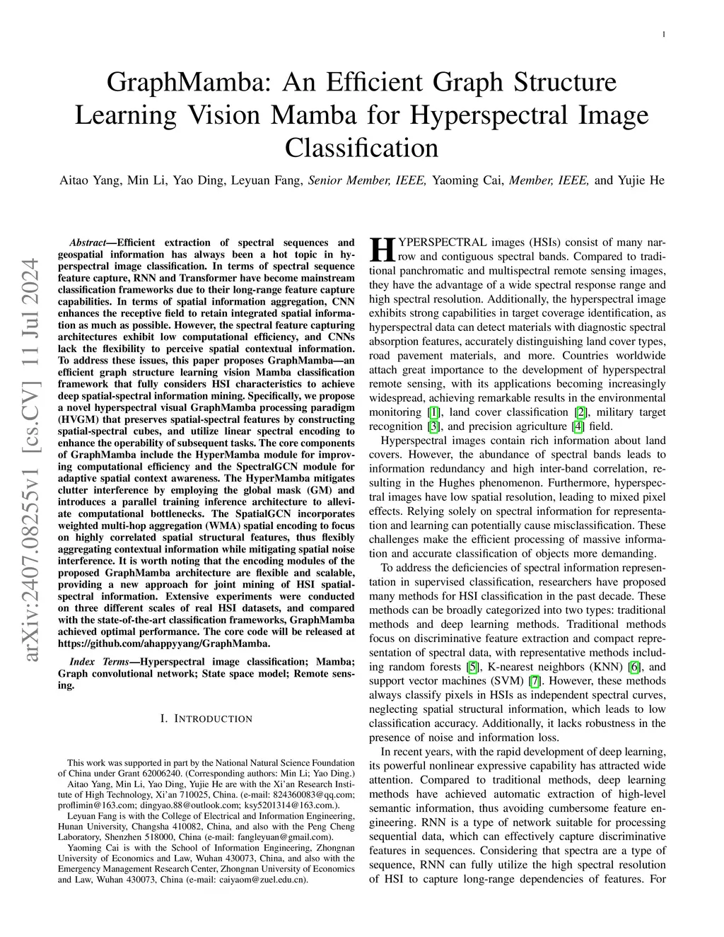 Efficient extraction of spectral sequences and geospatial information has always been a hot topic in hyperspectral image classification. In terms of spectral sequence feature capture, RNN and Transformer have become mainstream classification frameworks due to their long-range feature capture capabilities. In terms of spatial information aggregation, CNN enhances the receptive field to retain integrated spatial information as much as possible. However, the spectral feature-capturing architectures exhibit low computational efficiency, and CNNs lack the flexibility to perceive spatial contextual information. To address these issues, this paper proposes GraphMamba--an efficient graph structure learning vision Mamba classification framework that fully considers HSI characteristics to achieve deep spatial-spectral information mining. Specifically, we propose a novel hyperspectral visual GraphMamba processing paradigm (HVGM) that preserves spatial-spectral features by constructing spatial-spectral cubes and utilizes linear spectral encoding to enhance the operability of subsequent tasks. The core components of GraphMamba include the HyperMamba module for improving computational efficiency and the SpectralGCN module for adaptive spatial context awareness. The HyperMamba mitigates clutter interference by employing the global mask (GM) and introduces a parallel training inference architecture to alleviate computational bottlenecks. The SpatialGCN incorporates weighted multi-hop aggregation (WMA) spatial encoding to focus on highly correlated spatial structural features, thus flexibly aggregating contextual information while mitigating spatial noise interference. Extensive experiments were conducted on three different scales of real HSI datasets, and compared with the state-of-the-art classification frameworks, GraphMamba achieved optimal performance.