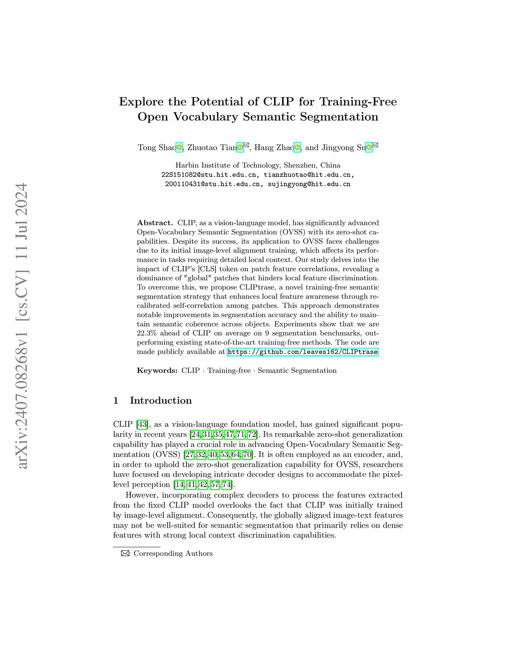 CLIP, as a vision-language model, has significantly advanced Open-Vocabulary Semantic Segmentation (OVSS) with its zero-shot capabilities. Despite its success, its application to OVSS faces challenges due to its initial image-level alignment training, which affects its performance in tasks requiring detailed local context. Our study delves into the impact of CLIP's [CLS] token on patch feature correlations, revealing a dominance of "global" patches that hinders local feature discrimination. To overcome this, we propose CLIPtrase, a novel training-free semantic segmentation strategy that enhances local feature awareness through recalibrated self-correlation among patches. This approach demonstrates notable improvements in segmentation accuracy and the ability to maintain semantic coherence across objects.Experiments show that we are 22.3% ahead of CLIP on average on 9 segmentation benchmarks, outperforming existing state-of-the-art training-free methods.The code are made publicly available at: https://github.com/leaves162/CLIPtrase.