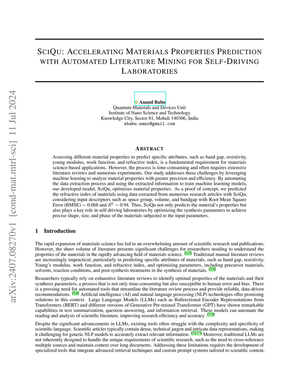 Assessing different material properties to predict specific attributes, such as band gap, resistivity, young modulus, work function, and refractive index, is a fundamental requirement for materials science-based applications. However, the process is time-consuming and often requires extensive literature reviews and numerous experiments. Our study addresses these challenges by leveraging machine learning to analyze material properties with greater precision and efficiency. By automating the data extraction process and using the extracted information to train machine learning models, our developed model, SciQu, optimizes material properties. As a proof of concept, we predicted the refractive index of materials using data extracted from numerous research articles with SciQu, considering input descriptors such as space group, volume, and bandgap with Root Mean Square Error (RMSE) 0.068 and R2 0.94. Thus, SciQu not only predicts the properties of materials but also plays a key role in self-driving laboratories by optimizing the synthesis parameters to achieve precise shape, size, and phase of the materials subjected to the input parameters.