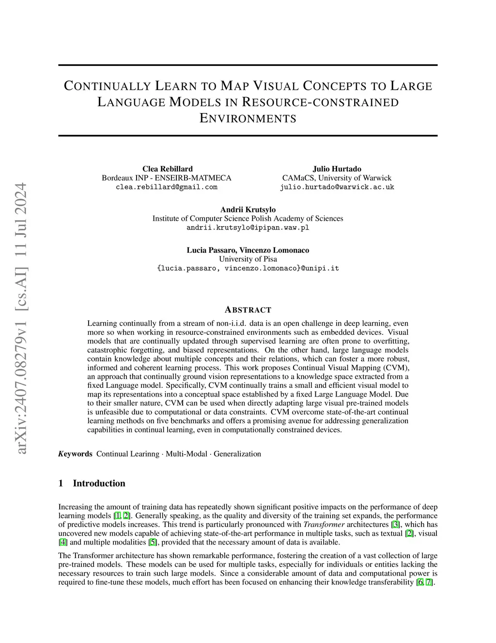 Learning continually from a stream of non-i.i.d. data is an open challenge in deep learning, even more so when working in resource-constrained environments such as embedded devices. Visual models that are continually updated through supervised learning are often prone to overfitting, catastrophic forgetting, and biased representations. On the other hand, large language models contain knowledge about multiple concepts and their relations, which can foster a more robust, informed and coherent learning process. This work proposes Continual Visual Mapping (CVM), an approach that continually ground vision representations to a knowledge space extracted from a fixed Language model. Specifically, CVM continually trains a small and efficient visual model to map its representations into a conceptual space established by a fixed Large Language Model. Due to their smaller nature, CVM can be used when directly adapting large visual pre-trained models is unfeasible due to computational or data constraints. CVM overcome state-of-the-art continual learning methods on five benchmarks and offers a promising avenue for addressing generalization capabilities in continual learning, even in computationally constrained devices.