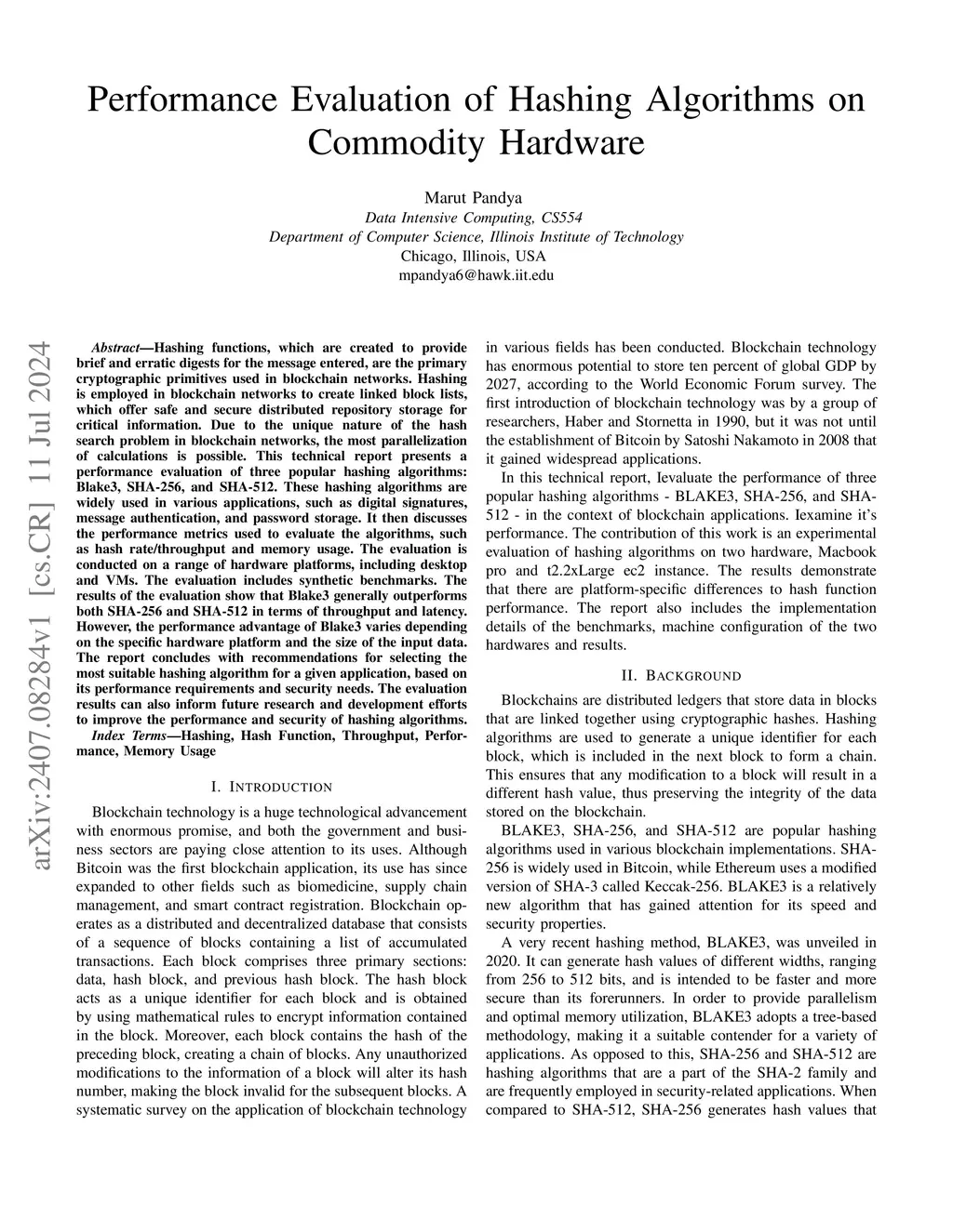 Hashing functions, which are created to provide brief and erratic digests for the message entered, are the primary cryptographic primitives used in blockchain networks. Hashing is employed in blockchain networks to create linked block lists, which offer safe and secure distributed repository storage for critical information. Due to the unique nature of the hash search problem in blockchain networks, the most parallelization of calculations is possible. This technical report presents a performance evaluation of three popular hashing algorithms Blake3, SHA-256, and SHA-512. These hashing algorithms are widely used in various applications, such as digital signatures, message authentication, and password storage. It then discusses the performance metrics used to evaluate the algorithms, such as hash rate/throughput and memory usage. The evaluation is conducted on a range of hardware platforms, including desktop and VMs. The evaluation includes synthetic benchmarks. The results of the evaluation show that Blake3 generally outperforms both SHA-256 and SHA-512 in terms of throughput and latency. However, the performance advantage of Blake3 varies depending on the specific hardware platform and the size of the input data. The report concludes with recommendations for selecting the most suitable hashing algorithm for a given application, based on its performance requirements and security needs. The evaluation results can also inform future research and development efforts to improve the performance and security of hashing algorithms.