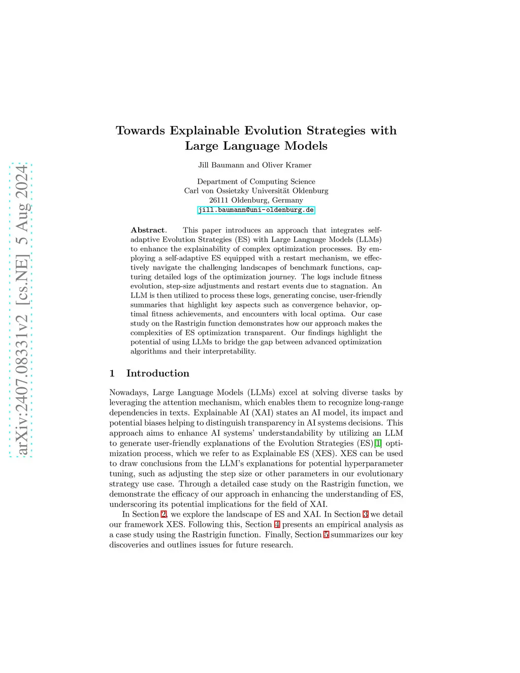 This paper introduces an approach that integrates self-adaptive Evolution Strategies (ES) with Large Language Models (LLMs) to enhance the explainability of complex optimization processes. By employing a self-adaptive ES equipped with a restart mechanism, we effectively navigate the challenging landscapes of benchmark functions, capturing detailed logs of the optimization journey. The logs include fitness evolution, step-size adjustments and restart events due to stagnation. An LLM is then utilized to process these logs, generating concise, user-friendly summaries that highlight key aspects such as convergence behavior, optimal fitness achievements, and encounters with local optima. Our case study on the Rastrigin function demonstrates how our approach makes the complexities of ES optimization transparent. Our findings highlight the potential of using LLMs to bridge the gap between advanced optimization algorithms and their interpretability.