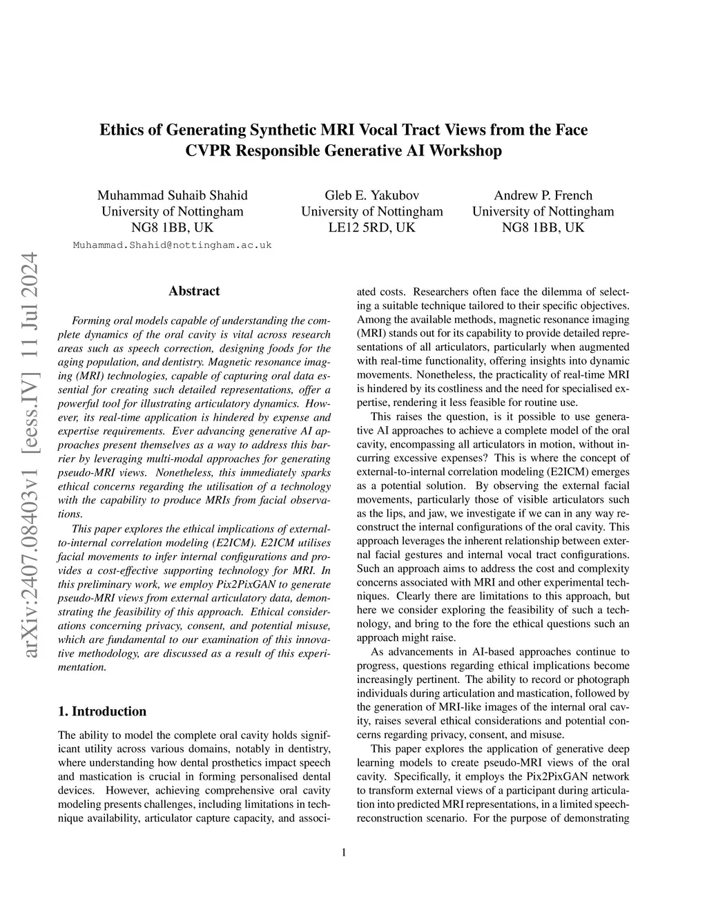 Forming oral models capable of understanding the complete dynamics of the oral cavity is vital across research areas such as speech correction, designing foods for the aging population, and dentistry. Magnetic resonance imaging (MRI) technologies, capable of capturing oral data essential for creating such detailed representations, offer a powerful tool for illustrating articulatory dynamics. However, its real-time application is hindered by expense and expertise requirements. Ever advancing generative AI approaches present themselves as a way to address this barrier by leveraging multi-modal approaches for generating pseudo-MRI views. Nonetheless, this immediately sparks ethical concerns regarding the utilisation of a technology with the capability to produce MRIs from facial observations. This paper explores the ethical implications of external-to-internal correlation modeling (E2ICM). E2ICM utilises facial movements to infer internal configurations and provides a cost-effective supporting technology for MRI. In this preliminary work, we employ Pix2PixGAN to generate pseudo-MRI views from external articulatory data, demonstrating the feasibility of this approach. Ethical considerations concerning privacy, consent, and potential misuse, which are fundamental to our examination of this innovative methodology, are discussed as a result of this experimentation.
