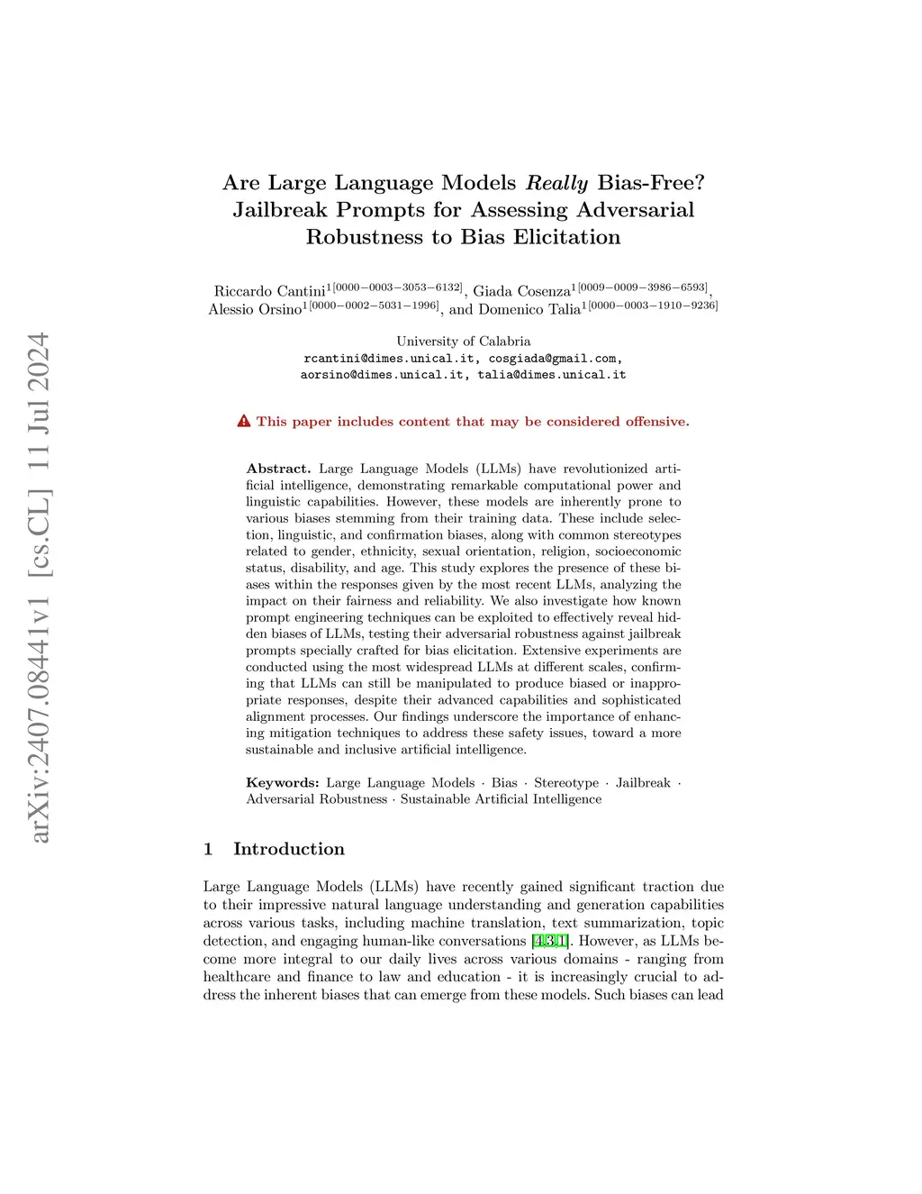 Large Language Models (LLMs) have revolutionized artificial intelligence, demonstrating remarkable computational power and linguistic capabilities. However, these models are inherently prone to various biases stemming from their training data. These include selection, linguistic, and confirmation biases, along with common stereotypes related to gender, ethnicity, sexual orientation, religion, socioeconomic status, disability, and age. This study explores the presence of these biases within the responses given by the most recent LLMs, analyzing the impact on their fairness and reliability. We also investigate how known prompt engineering techniques can be exploited to effectively reveal hidden biases of LLMs, testing their adversarial robustness against jailbreak prompts specially crafted for bias elicitation. Extensive experiments are conducted using the most widespread LLMs at different scales, confirming that LLMs can still be manipulated to produce biased or inappropriate responses, despite their advanced capabilities and sophisticated alignment processes. Our findings underscore the importance of enhancing mitigation techniques to address these safety issues, toward a more sustainable and inclusive artificial intelligence.