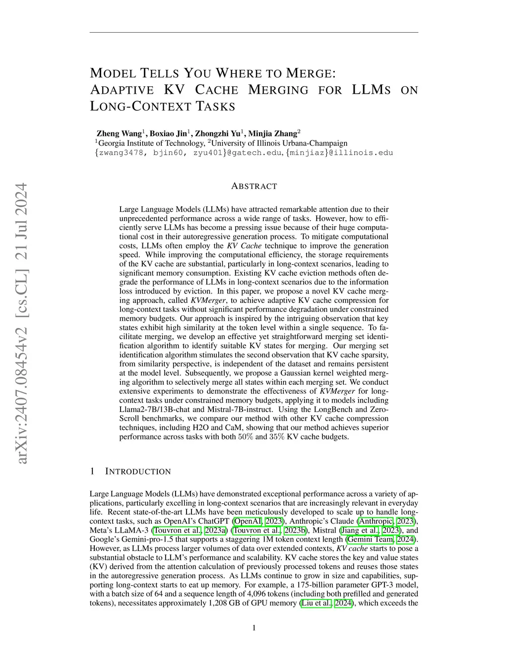 How to efficiently serve Large Language Models (LLMs) has become a pressing issue because of their huge computational cost in their autoregressive generation process. To mitigate computational costs, LLMs often employ the KV Cache technique to improve the generation speed. While improving the computational efficiency, the storage requirements of the KV cache are substantial, particularly in long-context scenarios, leading to significant memory consumption. Existing KV cache eviction methods often degrade the performance of LLMs in long-context scenarios due to the information loss introduced by eviction. In this paper, we propose a novel KV cache merging approach, called KVMerger, to achieve adaptive KV cache compression for long-context tasks without significant performance degradation under constrained memory budgets. Our approach is inspired by the intriguing observation that key states exhibit high similarity at the token level within a single sequence. To facilitate merging, we develop an effective yet straightforward merging set identification algorithm to identify suitable KV states for merging. Our merging set identification algorithm stimulates the second observation that KV cache sparsity, from similarity perspective, is independent of the dataset and remains persistent at the model level. Subsequently, we propose a Gaussian kernel weighted merging algorithm to selectively merge all states within each merging set. We conduct extensive experiments to demonstrate the effectiveness of KVMerger for long-context tasks under constrained memory budgets, applying it to models including Llama2-7B-chat and Llama2-13B-chat. Using the LongBench and ZeroScroll benchmarks, we compare our method with other KV cache compression techniques, including H2O and CaM, showing that our method achieves superior performance across tasks with both 50% and 35% KV cache budgets.