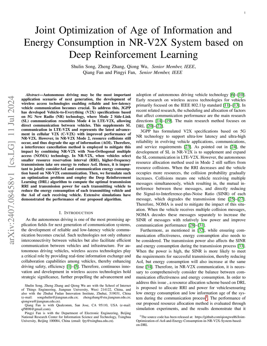 Autonomous driving may be the most important application scenario of next generation, the development of wireless access technologies enabling reliable and low-latency vehicle communication becomes crucial. To address this, 3GPP has developed Vehicle-to-Everything (V2X) specifications based on 5G New Radio (NR) technology, where Mode 2 Side-Link (SL) communication resembles Mode 4 in LTE-V2X, allowing direct communication between vehicles. This supplements SL communication in LTE-V2X and represents the latest advancement in cellular V2X (C-V2X) with improved performance of NR-V2X. However, in NR-V2X Mode 2, resource collisions still occur, and thus degrade the age of information (AOI). Therefore, a interference cancellation method is employed to mitigate this impact by combining NR-V2X with Non-Orthogonal multiple access (NOMA) technology. In NR-V2X, when vehicles select smaller resource reservation interval (RRI), higher-frequency transmissions take ore energy to reduce AoI. Hence, it is important to jointly consider AoI and communication energy consumption based on NR-V2X communication. Then, we formulate such an optimization problem and employ the Deep Reinforcement Learning (DRL) algorithm to compute the optimal transmission RRI and transmission power for each transmitting vehicle to reduce the energy consumption of each transmitting vehicle and the AoI of each receiving vehicle. Extensive simulations have demonstrated the performance of our proposed algorithm.