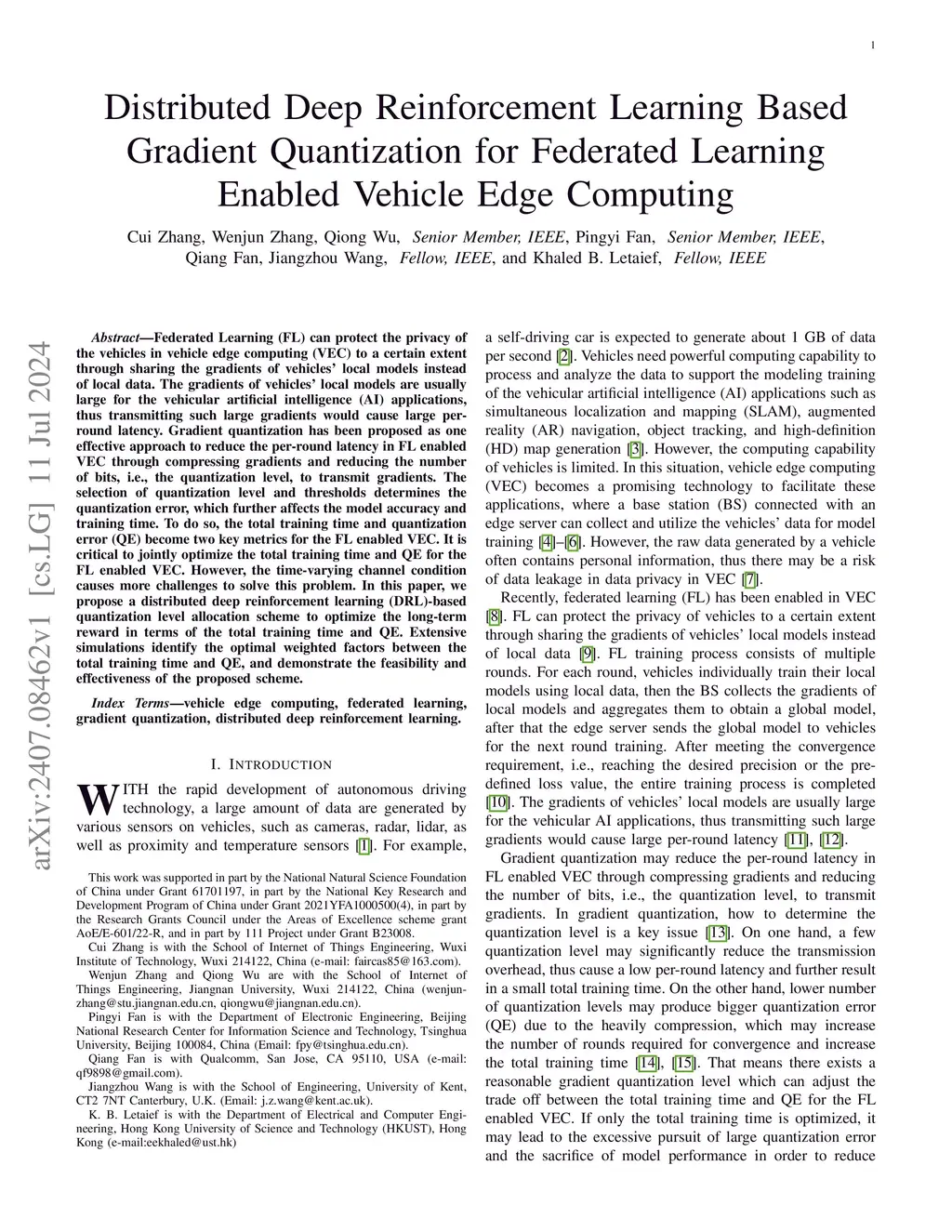 Distributed Deep Reinforcement Learning Based Gradient Quantization for Federated Learning Enabled Vehicle Edge Computing