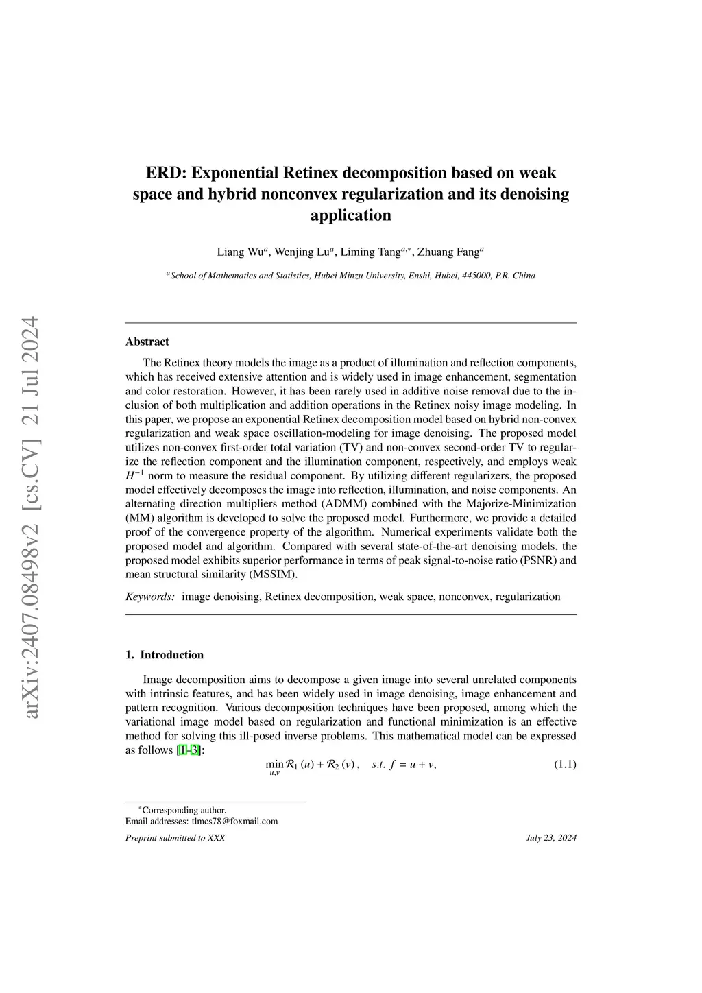 ERD: Exponential Retinex decomposition based on weak space and hybrid