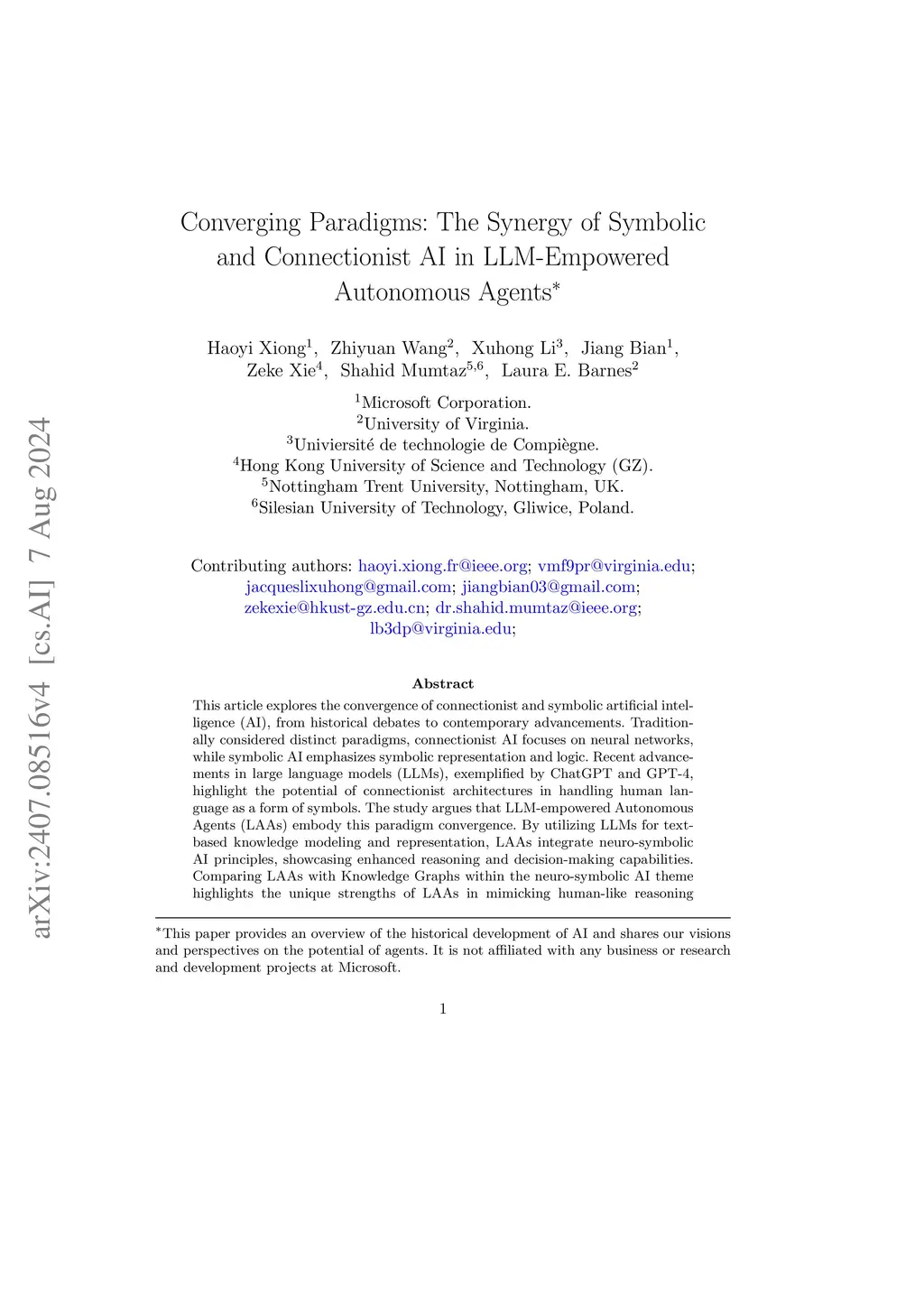 This article explores the convergence of connectionist and symbolic artificial intelligence (AI), from historical debates to contemporary advancements. Traditionally considered distinct paradigms, connectionist AI focuses on neural networks, while symbolic AI emphasizes symbolic representation and logic. Recent advancements in large language models (LLMs), exemplified by ChatGPT and GPT-4, highlight the potential of connectionist architectures in handling human language as a form of symbols. The study argues that LLM-empowered Autonomous Agents (LAAs) embody this paradigm convergence. By utilizing LLMs for text-based knowledge modeling and representation, LAAs integrate neuro-symbolic AI principles, showcasing enhanced reasoning and decision-making capabilities. Comparing LAAs with Knowledge Graphs within the neuro-symbolic AI theme highlights the unique strengths of LAAs in mimicking human-like reasoning processes, scaling effectively with large datasets, and leveraging in-context samples without explicit re-training. The research underscores promising avenues in neuro-vector-symbolic integration, instructional encoding, and implicit reasoning, aimed at further enhancing LAA capabilities. By exploring the progression of neuro-symbolic AI and proposing future research trajectories, this work advances the understanding and development of AI technologies.
