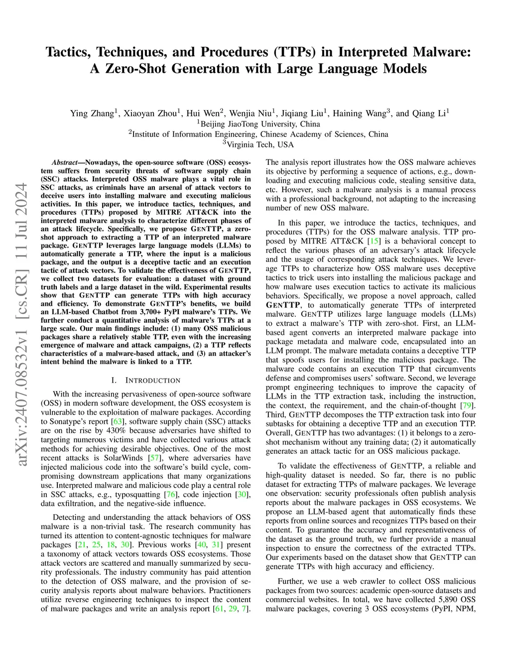 Nowadays, the open-source software (OSS) ecosystem suffers from security threats of software supply chain (SSC) attacks. Interpreted OSS malware plays a vital role in SSC attacks, as criminals have an arsenal of attack vectors to deceive users into installing malware and executing malicious activities. In this paper, we introduce tactics, techniques, and procedures (TTPs) proposed by MITRE ATT\&CK into the interpreted malware analysis to characterize different phases of an attack lifecycle. Specifically, we propose GENTTP, a zero-shot approach to extracting a TTP of an interpreted malware package. GENTTP leverages large language models (LLMs) to automatically generate a TTP, where the input is a malicious package, and the output is a deceptive tactic and an execution tactic of attack vectors. To validate the effectiveness of GENTTP, we collect two datasets for evaluation: a dataset with ground truth labels and a large dataset in the wild. Experimental results show that GENTTP can generate TTPs with high accuracy and efficiency. To demonstrate GENTTP's benefits, we build an LLM-based Chatbot from 3,700+ PyPI malware's TTPs. We further conduct a quantitative analysis of malware's TTPs at a large scale. Our main findings include: (1) many OSS malicious packages share a relatively stable TTP, even with the increasing emergence of malware and attack campaigns, (2) a TTP reflects characteristics of a malware-based attack, and (3) an attacker's intent behind the malware is linked to a TTP.