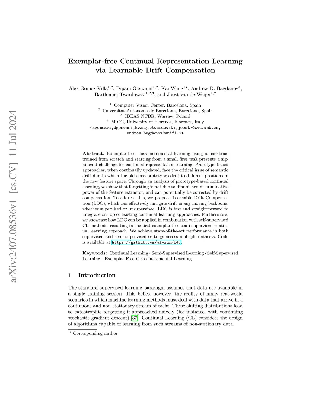 Exemplar-free class-incremental learning using a backbone trained from scratch and starting from a small first task presents a significant challenge for continual representation learning. Prototype-based approaches, when continually updated, face the critical issue of semantic drift due to which the old class prototypes drift to different positions in the new feature space. Through an analysis of prototype-based continual learning, we show that forgetting is not due to diminished discriminative power of the feature extractor, and can potentially be corrected by drift compensation. To address this, we propose Learnable Drift Compensation (LDC), which can effectively mitigate drift in any moving backbone, whether supervised or unsupervised. LDC is fast and straightforward to integrate on top of existing continual learning approaches. Furthermore, we showcase how LDC can be applied in combination with self-supervised CL methods, resulting in the first exemplar-free semi-supervised continual learning approach. We achieve state-of-the-art performance in both supervised and semi-supervised settings across multiple datasets. Code is available at \url{https://github.com/alviur/ldc}.