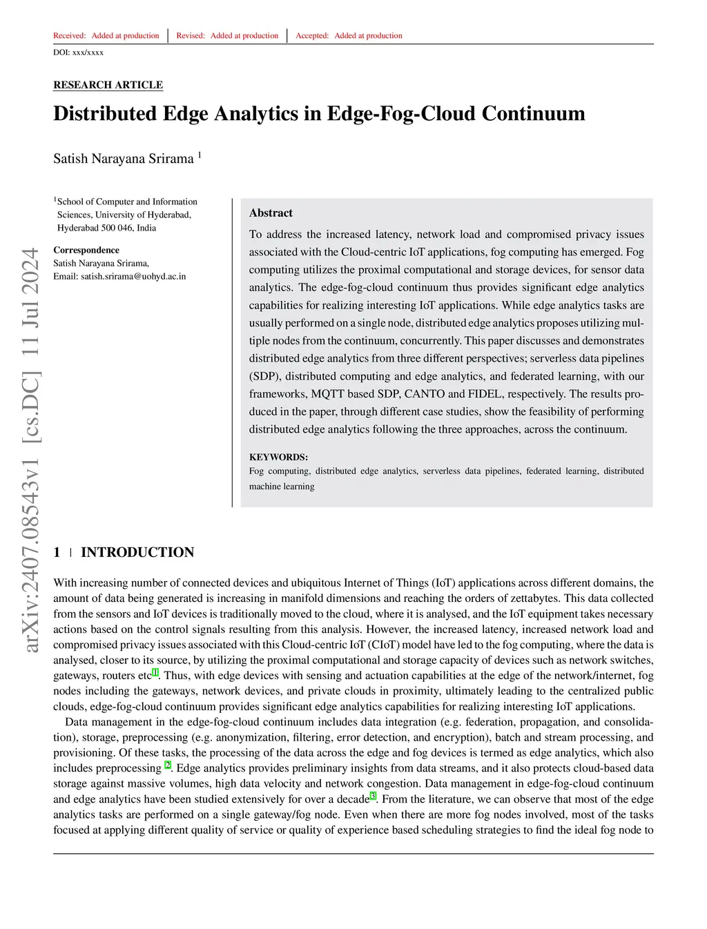 Distributed Edge Analytics in Edge-Fog-Cloud Continuum