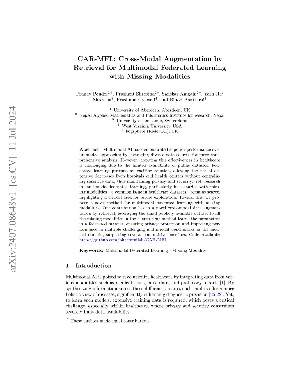 Multimodal AI has demonstrated superior performance over unimodal approaches by leveraging diverse data sources for more comprehensive analysis. However, applying this effectiveness in healthcare is challenging due to the limited availability of public datasets. Federated learning presents an exciting solution, allowing the use of extensive databases from hospitals and health centers without centralizing sensitive data, thus maintaining privacy and security. Yet, research in multimodal federated learning, particularly in scenarios with missing modalities a common issue in healthcare datasets remains scarce, highlighting a critical area for future exploration. Toward this, we propose a novel method for multimodal federated learning with missing modalities. Our contribution lies in a novel cross-modal data augmentation by retrieval, leveraging the small publicly available dataset to fill the missing modalities in the clients. Our method learns the parameters in a federated manner, ensuring privacy protection and improving performance in multiple challenging multimodal benchmarks in the medical domain, surpassing several competitive baselines. Code Available: https://github.com/bhattarailab/CAR-MFL