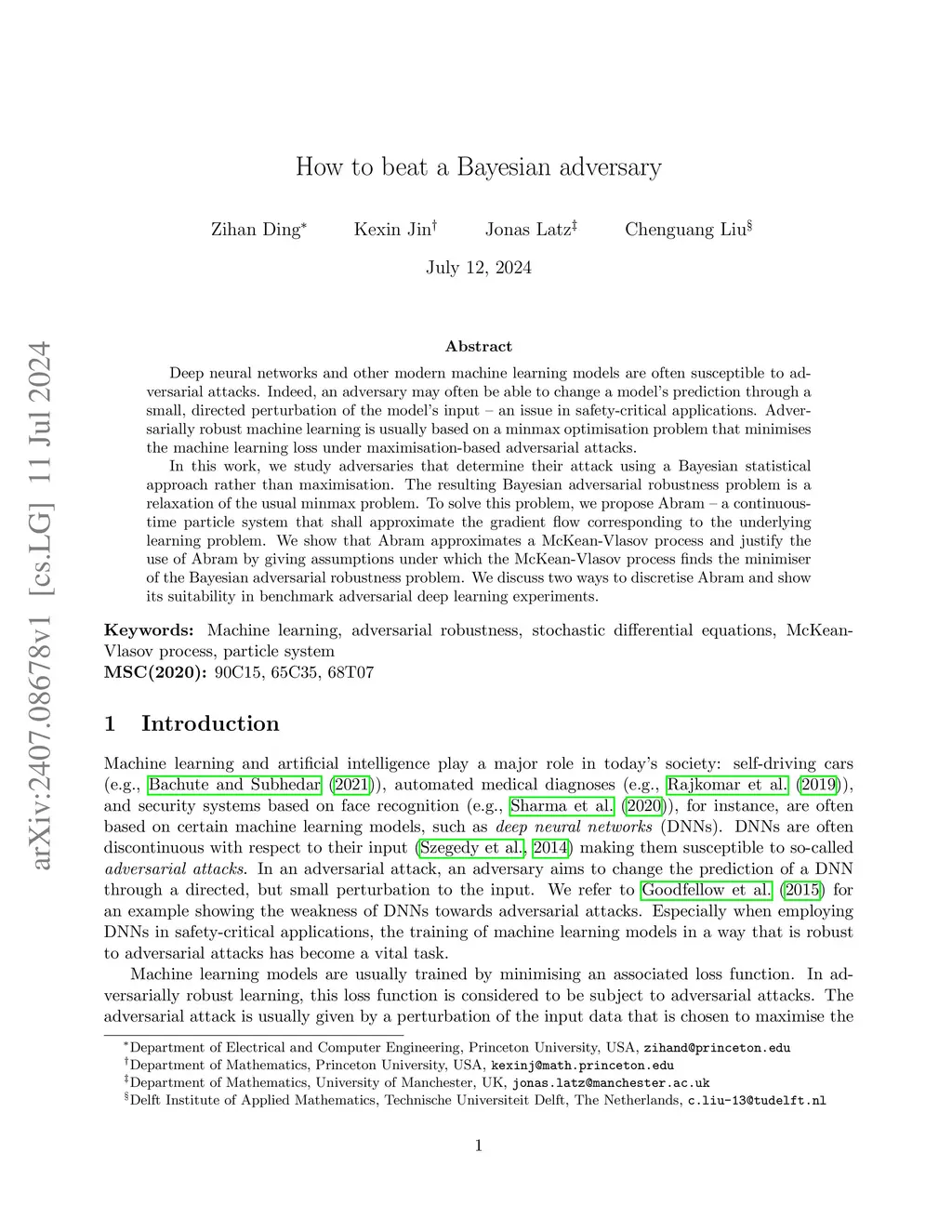Deep neural networks and other modern machine learning models are often susceptible to adversarial attacks. Indeed, an adversary may often be able to change a model's prediction through a small, directed perturbation of the model's input - an issue in safety-critical applications. Adversarially robust machine learning is usually based on a minmax optimisation problem that minimises the machine learning loss under maximisation-based adversarial attacks. In this work, we study adversaries that determine their attack using a Bayesian statistical approach rather than maximisation. The resulting Bayesian adversarial robustness problem is a relaxation of the usual minmax problem. To solve this problem, we propose Abram - a continuous-time particle system that shall approximate the gradient flow corresponding to the underlying learning problem. We show that Abram approximates a McKean-Vlasov process and justify the use of Abram by giving assumptions under which the McKean-Vlasov process finds the minimiser of the Bayesian adversarial robustness problem. We discuss two ways to discretise Abram and show its suitability in benchmark adversarial deep learning experiments.