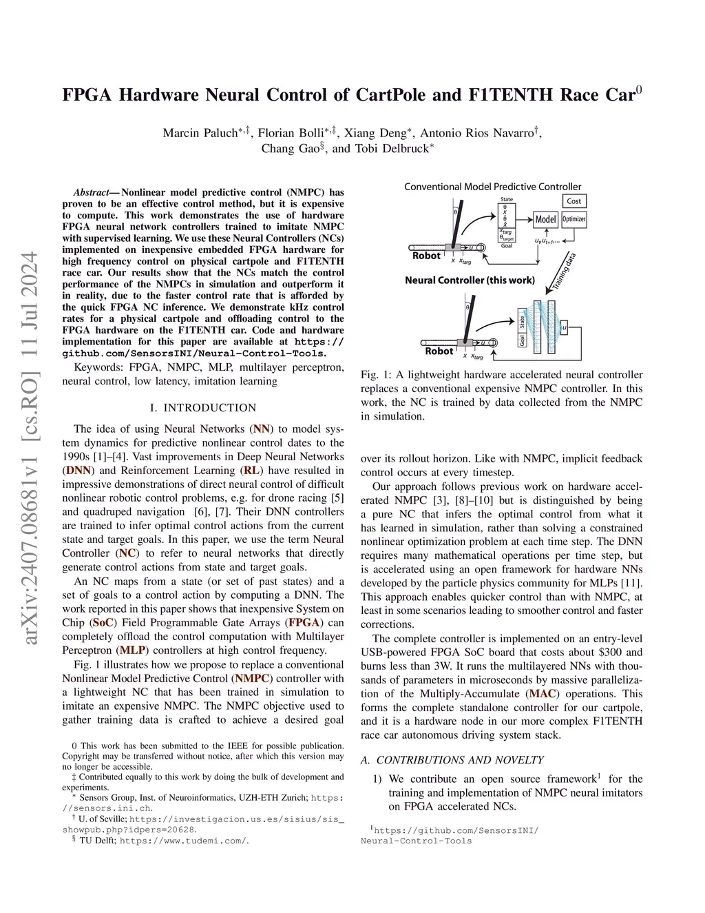 Hardware Neural Control of CartPole and F1TENTH Race Car
