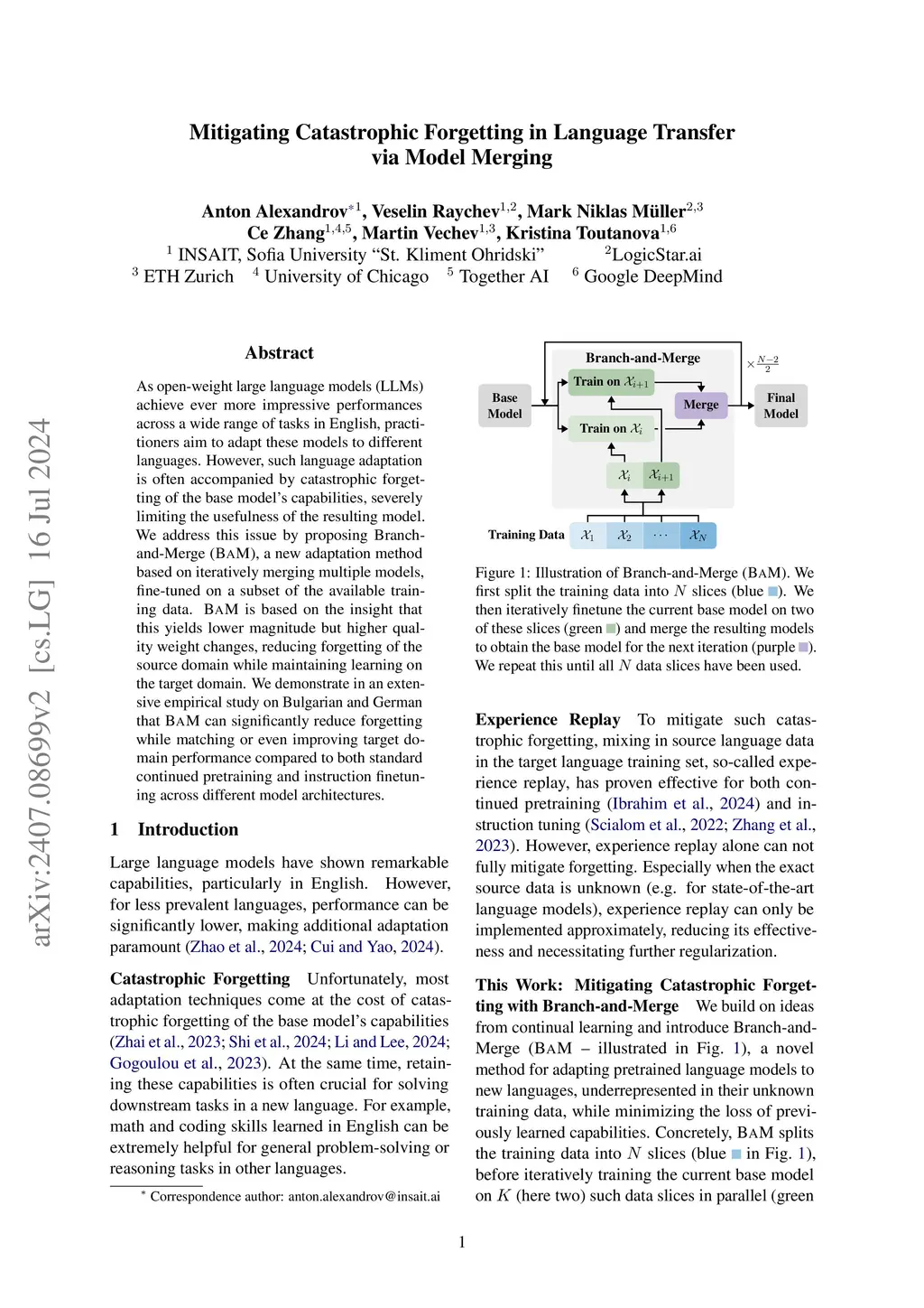 As open-weight large language models (LLMs) achieve ever more impressive performances across a wide range of tasks in English, practitioners aim to adapt these models to different languages. However, such language adaptation is often accompanied by catastrophic forgetting of the base model's capabilities, severely limiting the usefulness of the resulting model. We address this issue by proposing Branch-and-Merge (BaM), a new adaptation method based on iteratively merging multiple models, fine-tuned on a subset of the available training data. BaM is based on the insight that this yields lower magnitude but higher quality weight changes, reducing forgetting of the source domain while maintaining learning on the target domain. We demonstrate in an extensive empirical study on Bulgarian and German that BaM can significantly reduce forgetting while matching or even improving target domain performance compared to both standard continued pretraining and instruction finetuning across different model architectures.