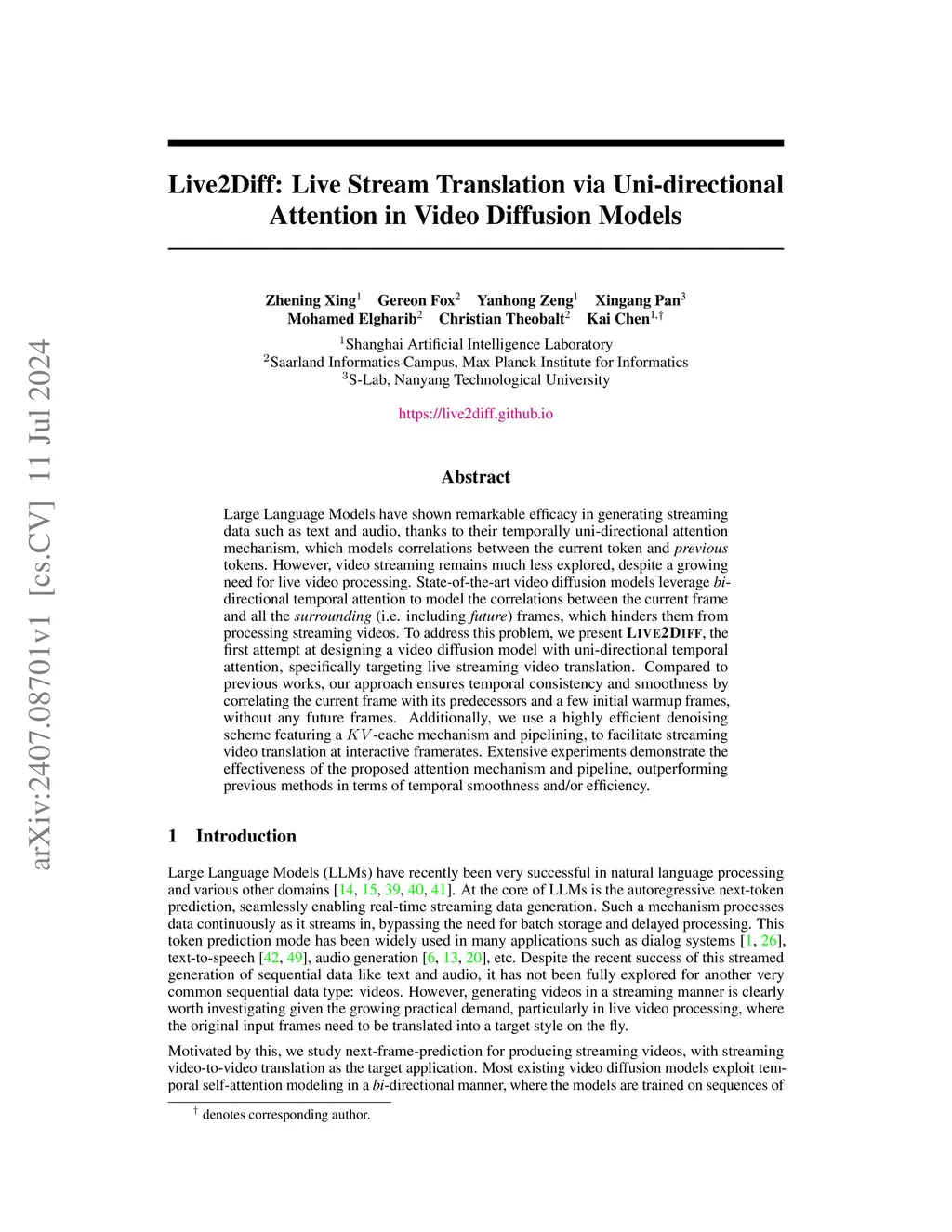 Large Language Models have shown remarkable efficacy in generating streaming data such as text and audio, thanks to their temporally uni-directional attention mechanism, which models correlations between the current token and previous tokens. However, video streaming remains much less explored, despite a growing need for live video processing. State-of-the-art video diffusion models leverage bi-directional temporal attention to model the correlations between the current frame and all the surrounding (i.e. including future) frames, which hinders them from processing streaming videos. To address this problem, we present Live2Diff, the first attempt at designing a video diffusion model with uni-directional temporal attention, specifically targeting live streaming video translation. Compared to previous works, our approach ensures temporal consistency and smoothness by correlating the current frame with its predecessors and a few initial warmup frames, without any future frames. Additionally, we use a highly efficient denoising scheme featuring a KV-cache mechanism and pipelining, to facilitate streaming video translation at interactive framerates. Extensive experiments demonstrate the effectiveness of the proposed attention mechanism and pipeline, outperforming previous methods in terms of temporal smoothness and/or efficiency.